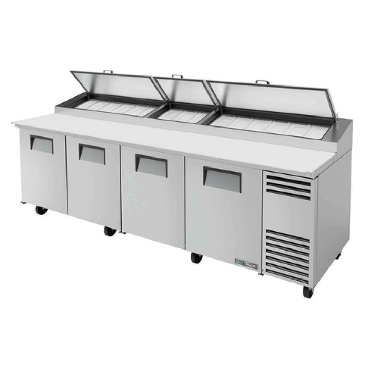 The True Refrigeration TPP-AT-119-HC Pizza Prep 33-41°F Pan Rail Stainless Steel Cover is engineered for high-efficiency foodservice operations, offering a precise temperature range between 33-41°F for optimal food preservation. This unit comes with a substantial 19-1/2"D cutting board and features four full doors for easy access, complemented by eight PVC-coated adjustable wire shelves for versatile storage solutions. The inclusion of fifteen 1/3 size clear polycarbonate insert pans on the top provides ample space for ingredient organization. Its robust stainless steel construction on the front, top, and sides, along with an aluminum interior and stainless steel floor, ensures durability and ease of maintenance. The True TPP-AT-119-HC is front-breathing, making it ideal for tight spaces without compromising performance. It utilizes R290 Hydrocarbon refrigerant and operates with a 3/4 HP compressor, 115v/60/1-ph power supply, and draws 7.1 amps with a NEMA 5-15P plug. Certified by UL EPH Classified, cULus, and CE, and made in the USA, this pizza prep table stands out for its combination of advanced refrigeration technology and high-quality design, catering to the diverse needs of pizzerias and commercial kitchens that demand reliable and efficient food preparation and storage solutions.