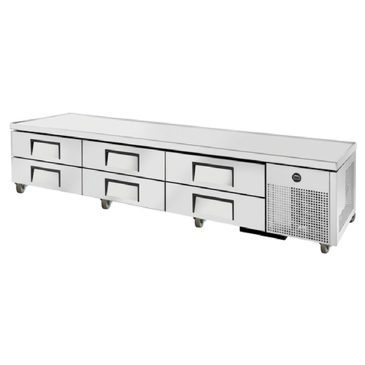 The True Refrigeration TRCB-110-HC Refrigerated Chef Base 110"W Base is a high-performance unit designed for demanding foodservice environments. Featuring a one-piece 300 series 18 gauge stainless steel top with a V edge, it ensures durability and easy cleaning. The chef base is equipped with six robust drawers that can accommodate up to two 12" x 20" x 4" pans each, although these pans are not included. The exterior boasts a stainless steel front and sides, while the back is constructed with aluminum, adding to its resilience. Inside, the aluminum interior is complemented with a stainless steel floor, providing a reliable, easy-to-maintain surface. For mobility and convenience, the base sits on 4" castors. The unit utilizes R290 Hydrocarbon refrigerant and is powered by a 1/3 HP motor, operating on a 115v/60/1-ph electrical connection with a 4.4 amp draw, and comes with a NEMA 5-15P plug. It is cULus, UL EPH Classified, and CE certified, ensuring compliance with high safety and performance standards. Made in the USA, this chef base is a robust solution for any kitchen requiring reliable refrigerated storage at an accessible height, making it ideal for both large scale and boutique culinary operations.