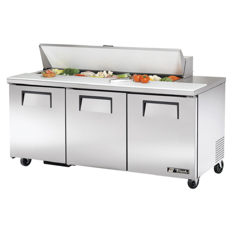 The True Refrigeration TSSU-72-16-HC Sandwich/Salad Unit is a top-tier choice for foodservice establishments needing efficient and reliable cold storage solutions. This unit features (16) 1/6 size (4"D) poly pans, providing ample space for ingredients, whether you're crafting sandwiches or preparing salads. The stainless steel insulated cover ensures optimal temperature retention, while the 11-3/4"D cutting board offers a convenient workspace. With (3) full doors and (6) PVC coated adjustable wire shelves, the unit maximizes storage flexibility and accessibility. Constructed with a robust stainless steel top, front, and sides, alongside a GalFan coated steel back and an aluminum interior with a stainless steel floor, this unit stands out for its durability and ease of maintenance. The environmentally friendly R290 Hydrocarbon refrigerant and 1/2 HP compressor guarantee efficient cooling performance. Operating at 115v/60/1-ph and drawing 7.2 amps, it is equipped with a NEMA 5-15P plug. The unit meets cULus and UL EPH safety standards and is proudly made in the USA. The True TSSU-72-16-HC is a versatile and dependable asset for any professional kitchen, ensuring consistent and high-quality food preservation.