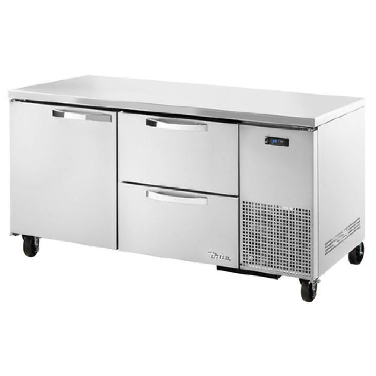 The True Refrigeration TUC-67D-2-HC~SPEC3 SPEC SERIES® Deep Undercounter Refrigerator is a high-performance refrigeration unit engineered for commercial kitchens. This undercounter refrigerator maintains temperatures between 33 - 38°F, ensuring optimal preservation of perishables. Its side-mounted, self-contained refrigeration system utilizes R290 Hydrocarbon refrigerant, promoting energy efficiency and environmental sustainability. The refrigerator is part of the SPEC Package 3, which features a stainless steel top, enhancing durability and ease of cleaning. It includes one heavy-duty stainless steel door and two PVC coated adjustable wire shelves for flexible storage solutions. Additionally, it is equipped with two drawers that accommodate two 12" x 20" x 8" pans, providing versatility in organizing ingredients (pans not included). The electronic temperature control with a digital display offers precision in monitoring temperature settings. With stainless steel sides and back, along with a stainless steel interior, this unit is both robust and stylish. The device operates on 1/10 HP and requires a 115v/60/1-ph electrical connection, drawing 1.7 amps. It is fitted with a NEMA 5-15P plug. This refrigerator meets cULus and UL EPH Classified standards and is proudly made in the USA, making it a reliable choice for foodservice professionals seeking quality refrigeration solutions.