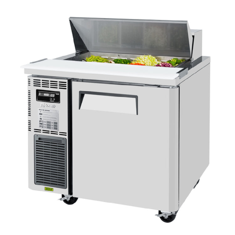 The Turbo Air JST-36-N J Series Sandwich/Salad Unit is a versatile refrigeration solution designed for efficient kitchen environments, featuring a one-section, front air intake system. With dimensions of 35-3/8"W x 27-1/2"D x 35-3/4"H, it offers a compact yet spacious 7.5 cu. ft. capacity, perfect for small to medium-sized food service operations. The unit's top features an 8-pan opening with a convenient hood, catering to sandwich or salad preparation. Its durable stainless steel construction on the top, front, and sides, coupled with a galvanized steel back and bottom, ensures longevity and resilience in demanding kitchens. The unit includes a stainless steel swing door and a PE coated wire shelf, providing flexible storage options. A 9-1/2" deep cutting board with side rail enhances preparation efficiency. Its advanced digital temperature control and LED interior lighting & fan control optimize energy use and product visibility. Using R290 Hydrocarbon refrigerant and powered by a 1/3 HP compressor, the unit operates at 115v/60/1-ph with a 2.4 amp draw, making it a reliable choice for energy-conscious businesses. Certified by cETLus and ETL-Sanitation, the Turbo Air JST-36-N combines robust functionality with essential standards for diverse food service applications.