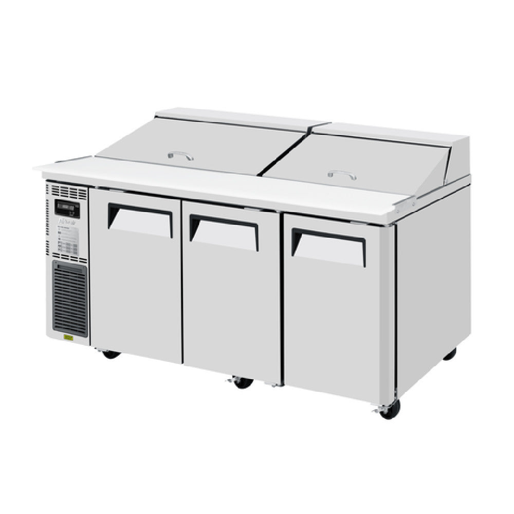 The Turbo Air JST-72-N J Series Sandwich/Salad Unit Three-section Front Air Intake is a versatile refrigeration solution tailored for the food service industry. Measuring 70-7/8 inches in width, 27-1/2 inches in depth, and 35-3/4 inches in height, this unit offers substantial storage with an 18 cubic feet capacity. It features an 18-pan top opening equipped with two hoods, allowing for efficient organization and access to ingredients. The unit includes three stainless steel swing doors, accompanied by three PE coated wire shelves, providing durable and easy-to-clean storage options. A 9-1/2 inch deep cutting board with side rail enhances preparation convenience. The technical design includes a side mount self-contained compressor and front air intake, utilizing R290 Hydrocarbon refrigerant with a 2/5 HP compressor. Its digital temperature control ensures precision, while LED interior lighting and fan control add to its energy efficiency. Constructed with a stainless steel top, front, and sides, alongside a galvanized steel back and bottom, the unit promises durability and longevity. The stainless steel interior floor and aluminum side panels and door liner ensure hygienic storage conditions. Operating at 115v/60/1-ph and 3.2 amps, it is fitted with a NEMA 5-15P plug and is cETLus and ETL-Sanitation certified, highlighting its compliance with industry standards.