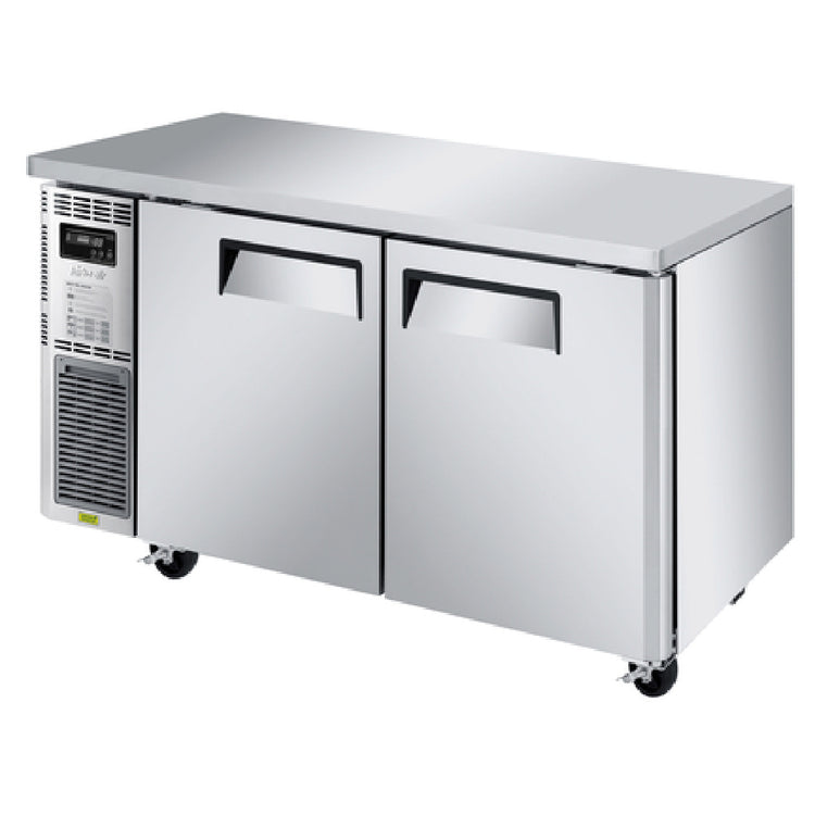 The Turbo Air JUF-60S-N J Series Side Mount Undercounter Freezer - narrow, two-section, is designed to cater to the specific needs of commercial kitchens requiring compact and efficient freezing solutions. Measuring 59"W x 23-5/8"D x 28-3/4"H, this freezer offers a storage capacity of 11.31 cubic feet, making it suitable for small to medium-sized operations. It features a front air intake and a side mount self-contained compressor, ensuring efficient and consistent cooling. The freezer is equipped with two stainless steel doors with recessed handles, enhancing durability and ease of use. Inside, two PE-coated wire shelves provide organized storage, illuminated by energy-efficient LED interior lighting. The stainless steel exterior, combined with a galvanized steel back and bottom, offers robust construction, while the aluminum interior and door liners with a stainless steel floor ensure compliance with hygiene standards. Operating with an eco-friendly R290 Hydrocarbon refrigerant, this unit utilizes a 3/8 HP compressor, running on 115v/60/1-ph with a 4.0 amp draw, and is equipped with a NEMA 5-15P plug. Certified by cETLus and ETL-Sanitation, this freezer is a reliable choice for various segments within the foodservice industry, emphasizing energy efficiency and compact design.