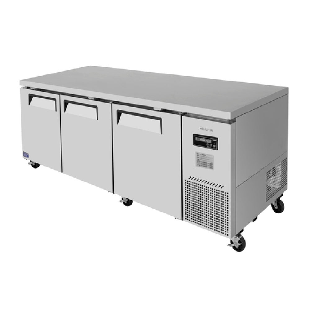 The Turbo Air JUR-93D-N J Series Side Mount Undercounter Refrigerator is an advanced three-section refrigeration unit designed for commercial environments. With dimensions of 93"W x 32-1/4"D x 30"H, this refrigerator provides an ample 30 cubic feet of storage space. It features a front air intake system and a side mount self-contained compressor, ensuring efficient cooling performance. The exterior is robustly constructed from stainless steel, with a galvanized steel back and bottom for added durability. Inside, the unit has an aluminum interior with stainless steel floor and door liners, enhancing its longevity and ease of cleaning. The three stainless steel doors come with recessed handles, promoting a sleek design, while the six PE coated wire shelves provide flexible storage options. LED interior lighting allows for clear visibility of stored items. Utilizing R290 Hydrocarbon refrigerant, the refrigerator is environmentally friendly and efficient. It operates on 1/2+ HP, 115v/60/1-ph power, drawing 5.1 amps, and is equipped with a NEMA 5-15P plug. Certified by cETLus and ETL-Sanitation, this unit promises compliance with stringent safety and sanitation standards, making it an ideal choice for diverse market segments such as restaurants, cafes, and catering operations.