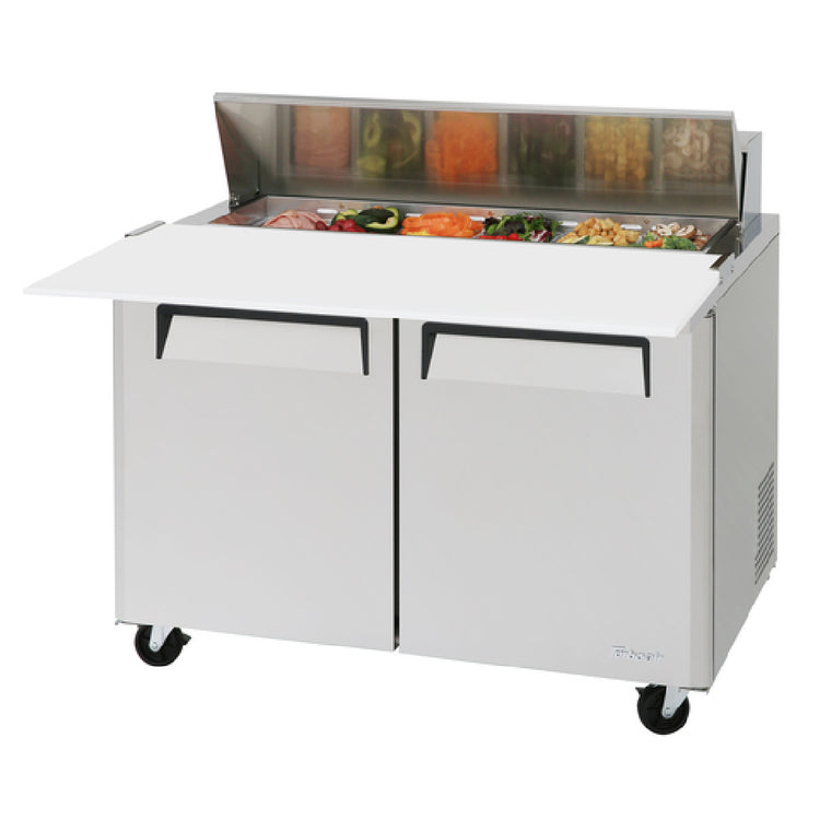 The Turbo Air MST-48-12-N M3 Series Sandwich/Salad Unit is a two-section refrigeration powerhouse, ideal for any foodservice operation focused on fresh and efficient preparation. Equipped with a rear mount self-contained compressor, this unit features a spacious 12.0 cu. ft. capacity, providing ample room for ingredients. Its 12-pan top opening includes a hood, ensuring easy access and organization for sandwich and salad assembly. The unit is tailored for versatility with two swing doors and two adjustable PE coated wire shelves, optimizing storage possibilities. A 17" deep cutting board with a side rail allows for efficient workspace management. The digital temperature control and self-cleaning condenser are highlights of its advanced technology, ensuring precise cooling and maintenance ease. The cold bunker system guarantees consistent temperature regulation. Constructed with a stainless steel top, front, and sides, it boasts durability, while the galvanized steel back and bottom add structural integrity. Inside, the aluminum interior with a stainless steel floor and ABS door liner supports robust use. LED interior lighting and fan control enhance visibility and energy efficiency. Utilizing R290 Hydrocarbon refrigerant, powered by a 1/3 HP motor, this unit operates at 115v/60/1-ph with 4.4 amps, and includes a NEMA 5-15P plug, meeting cETLus and ETL-Sanitation standards.