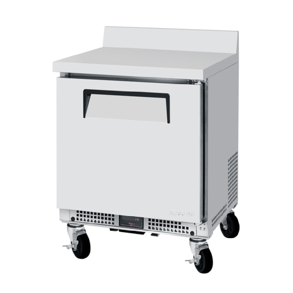 The Turbo Air MWR-24S-N6 M3 Worktop Refrigerator - Shallow Depth One-section is a compact refrigeration solution designed for efficiency and functionality across various industry segments. With a shallow depth design, this model measures 24"W x 23-1/2"D x 34-1/8"H, fitting seamlessly into tight spaces while providing ample storage. It boasts a 2.86 cu. ft. capacity, making it suitable for small-scale operations or as supplementary storage in larger setups. The unit features a stainless steel work top with a backsplash, ensuring durability and easy cleaning. A single solid door and one polyethylene-coated adjustable shelf provide versatile storage options. The refrigerator's digital temperature control and LED interior lighting enhance usability, allowing for precise temperature management and visibility. Constructed with a stainless steel exterior and an aluminum interior with a stainless steel floor, it offers robustness and longevity. Utilizing R-600A Hydrocarbon refrigerant, this model is an eco-friendly choice. The refrigeration system is self-contained with a 1/6 HP motor, operating efficiently at 115v/60/1-ph with a 2.4 amp draw. Certified by ETL-Sanitation and cETLus, the Turbo Air MWR-24S-N6 is a reliable option for those seeking efficient refrigeration in a compact footprint.