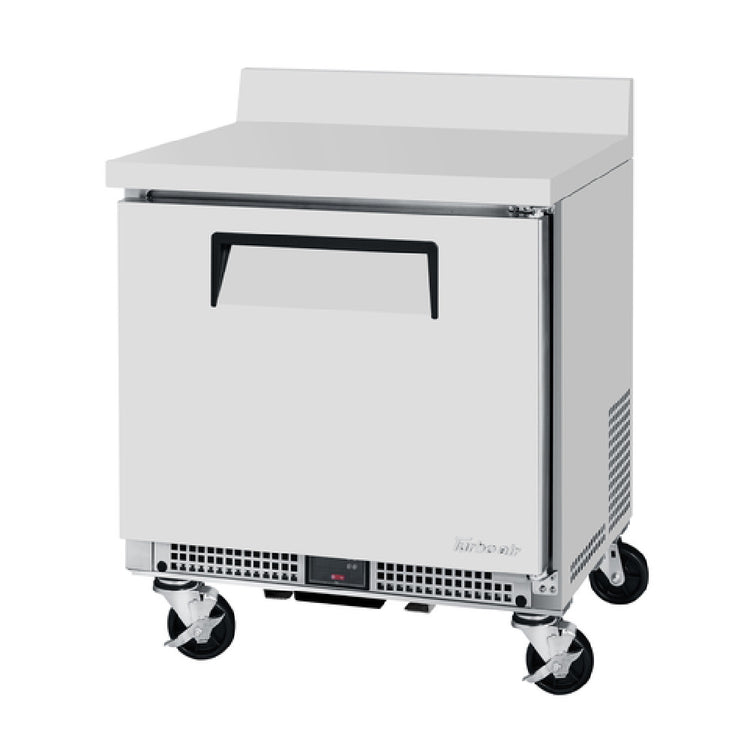 The Turbo Air MWR-27S-N6 M3 Worktop Refrigerator - Shallow Depth One-section - is a highly efficient refrigeration solution designed for space-conscious environments. With a compact footprint measuring 27"W x 23-1/2"D x 34-1/8"H, this refrigerator offers a storage capacity of 3.28 cubic feet, making it ideal for cafes, small kitchens, or food preparation stations where space is limited. It features a stainless steel worktop with a backsplash for added convenience and durability. The unit is equipped with a self-contained refrigeration system that utilizes the eco-friendly R-600A Hydrocarbon refrigerant, paired with a 1/6 horsepower compressor, ensuring energy-efficient operation. Inside, the refrigerator boasts a robust aluminum interior with a stainless steel floor and includes one solid door and one polyethylene-coated adjustable shelf, providing flexible storage options. The digital temperature control and LED interior lighting allow for precise temperature management and enhanced visibility. Powered by a 115v/60/1-ph connection using a standard NEMA 5-15P plug, the refrigerator operates at 2.4 amps, aligning with industry standards for safety and sanitation, as evidenced by its ETL-Sanitation and cETLus certifications. This refrigerator is a reliable choice for maintaining optimal food safety and quality in professional settings.