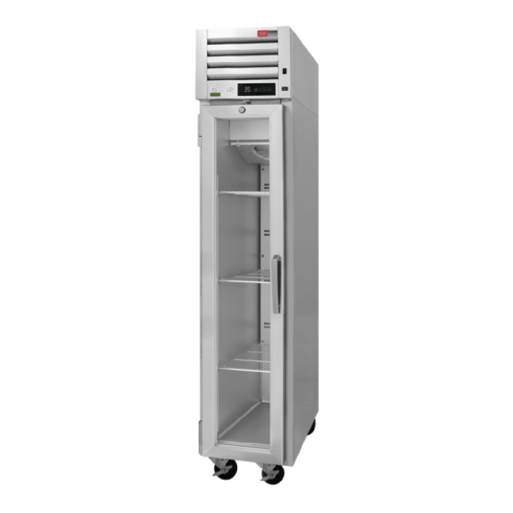 The Turbo Air PRO-12R-G-N(-L) PRO Series Refrigerator is a high-performance, reach-in, one-section unit, boasting a 9.47 cubic feet capacity, ideal for various professional kitchen environments. With dimensions of 17-3/4"W x 27-1/4"D x 78"H, it fits efficiently into compact spaces. This refrigerator features a top-mount self-contained refrigeration system, ensuring optimal cooling performance. It is equipped with a self-cleaning condenser device, reducing maintenance needs and enhancing system efficiency. The digital temperature controller and self-diagnostic monitoring system offer precision and reliability, adding to its appeal in high-demand settings. The hot gas condensate system and automatic fan motor delays contribute to energy efficiency and durability. The unit includes a hinged glass door, complete with a lock and lifetime-guaranteed heavy-duty hinges and handles, providing secure and easy access. LED interior lighting enhances visibility, while the three stainless steel wire shelves allow flexible storage solutions. Constructed with a stainless steel interior and exterior, along with a galvanized top and bottom, it ensures longevity and resistance against wear. Utilizing R290 Hydrocarbon refrigerant and operating at 1/4+ HP, 115v/60/1-ph, 2.5 amps, it is both powerful and environmentally conscious. This refrigerator meets cETLus and ETL-Sanitation standards and is proudly made in the USA.