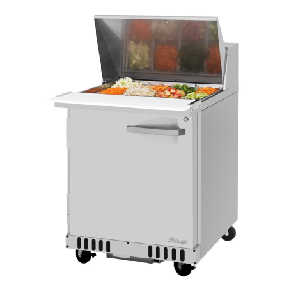The Turbo Air PST-28-12-FB-N(-L) PRO Series Mega Top Sandwich/Salad Prep Table - Front Breathing Airflow is a meticulously engineered piece of equipment designed for efficient food preparation in commercial kitchens. With a single section offering a capacity of 6.5 cubic feet, the unit measures 27-1/2 inches in width, 34 inches in depth, and 39-1/8 inches in height. This prep table is equipped with a stainless steel top that features a 12-pan opening for organized ingredient accessibility. The exterior and interior are constructed from robust stainless steel, complemented by a galvanized steel bottom for enhanced durability. A solid hinged swing door with a lock ensures secure storage. Inside, there is one stainless steel wire shelf to facilitate organized storage. The self-cleaning condenser utilizes R290 Hydrocarbon refrigerant, powered by a 1/5 HP motor, and operates on 115v/60/1-ph with 3.8 amps, fitted with a NEMA 5-15P plug. Certified by cETLus and ETL-Sanitation, this product meets high standards of safety and sanitation. Proudly made in the USA, the Turbo Air PST-28-12-FB-N(-L) is a valuable asset for food service operations, offering reliability and precision in food preparation and storage.
