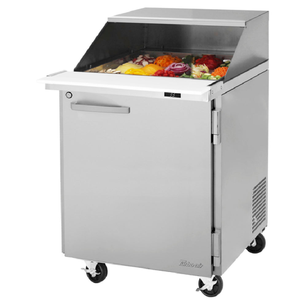 The Turbo Air PST-28-12-N-SL PRO Series Mega Top Sandwich/Salad Prep Table with Slide Lid is a highly efficient solution tailored for the food service industry, providing an optimal blend of storage and preparation space. This one-section unit features an 8.0 cu. ft. capacity, offering ample storage within its rear mount self-contained compressor. The 12-pan top opening, accompanied by a hood, facilitates organized preparation, while the solid hinged swing door with lock ensures secure storage. Its aluminum door liner and stainless steel interior and exterior (galvanized bottom) underscore its durability and hygiene standards, complemented by a stainless steel shelf for versatile storage. The unit includes a 9-1/2" deep cutting board with a side rail, enhancing its utility for salad and sandwich preparation. It boasts advanced features such as a digital temperature control & monitor system and a cold bunker system, ensuring precise temperature management. The self-cleaning condenser, coupled with LED interior lighting & fan control, reduces maintenance effort and enhances visibility. Designed with environmental consciousness, it utilizes R290 Hydrocarbon refrigerant, and operates at 1/6 HP, 115v/60/1-ph, 6.6 amps, with NEMA 5-15P compatibility. The product is cETLus and ETL-Sanitation certified, and is proudly made in the USA.