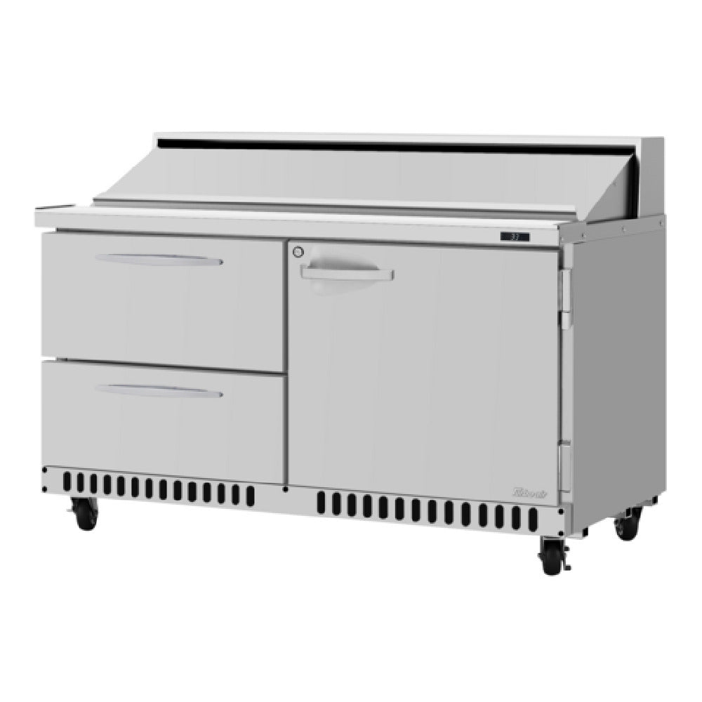 The Turbo Air PST-60-D2R(L)-FB-N PRO Series Sandwich/Salad Prep Table - Front Breathing Airflow is a versatile and efficient solution designed for food service operations requiring precise refrigeration and preparation space. With dimensions of 60-1/4"W x 30"D x 37"H, it offers a substantial 14.8 cubic feet capacity, ideal for high-volume sandwich and salad prep. Its stainless steel top is equipped with a 16-pan opening, allowing seamless ingredient organization and access. The unit is constructed with a durable stainless steel interior and exterior, complemented by a galvanized steel bottom for added resilience. Featuring a solid hinged swing door with a lock and two drawers, this prep table ensures secure and convenient storage. A stainless steel wire shelf adds to the versatility, while the self-cleaning condenser enhances maintenance efficiency. Utilizing R290 Hydrocarbon refrigerant and powered by a 1/5 HP motor, this unit operates on 115v/60/1-ph, drawing 8.9 amps with a NEMA 5-15P plug. Certified by cETLus and ETL-Sanitation, and proudly made in the USA, the Turbo Air PST-60-D2R(L)-FB-N is ideal for establishments prioritizing superior refrigeration, hygiene, and efficient workspace utilization within the food industry.