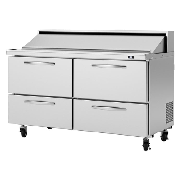 The Turbo Air PST-60-D4-N PRO Series Sandwich/Salad Unit is a highly efficient and versatile refrigeration solution, ideal for various segments in the foodservice industry. With a robust 16.0 cubic foot capacity, it is designed to handle high-volume sandwich and salad preparation. Featuring a 16-pan top opening with hood, it allows for convenient access and organization of ingredients. The unit is equipped with four durable drawers and a 9-1/2 inch deep cutting board, complete with a side rail for enhanced functionality. Its rear mount self-contained compressor ensures optimal cooling performance through the advanced cold bunker system, maintaining precise temperature control with a digital monitor system. Constructed with stainless steel for both the interior and exterior, alongside a galvanized bottom, this unit is built for durability and easy maintenance. The self-cleaning condenser, powered by a 1/5 HP compressor and using R290 Hydrocarbon refrigerant, enhances sustainability and energy efficiency. Operating on 115 volts with an 8.9 amp draw, it fits standard electrical setups with a NEMA 5-15P plug. Certified by cETLus and ETL-Sanitation, and proudly made in the USA, the Turbo Air PST-60-D4-N is a premium choice for those requiring reliability and superior food preservation.