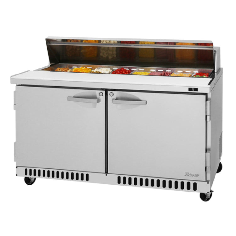 The Turbo Air PST-60-FB-N PRO Series Sandwich/Salad Prep Table is a versatile and high-performing solution for food service establishments, offering precise specifications tailored for efficient food preparation. With its front-breathing airflow design, this two-section table features a rear mount self-contained compressor with a 14.8 cubic feet capacity, making it an ideal fit for kitchens where space is a premium. Measuring 60-1/4 inches in width, 30 inches in depth, and 37 inches in height, this prep table is engineered for optimal space utilization. It boasts a 16-pan top opening with a hood, complemented by dual solid hinged swing doors that include locks for added security. The aluminum door liner and two shelves provide additional utility. Equipped with a 9-1/2 inch deep cutting board with side rail, digital temperature control and monitor system, and a cold bunker system, it ensures precise temperature management. Crafted with a stainless steel interior and exterior with a galvanized bottom, it is both durable and easy to clean. The LED interior lighting and fan control enhance visibility and energy efficiency. Featuring a self-cleaning condenser and using R290 Hydrocarbon refrigerant, this prep table operates with a 1/3 HP motor at 115 volts, consuming 4.4 amps, and is certified by cETLus and ETL-Sanitation standards, proudly made in the USA.