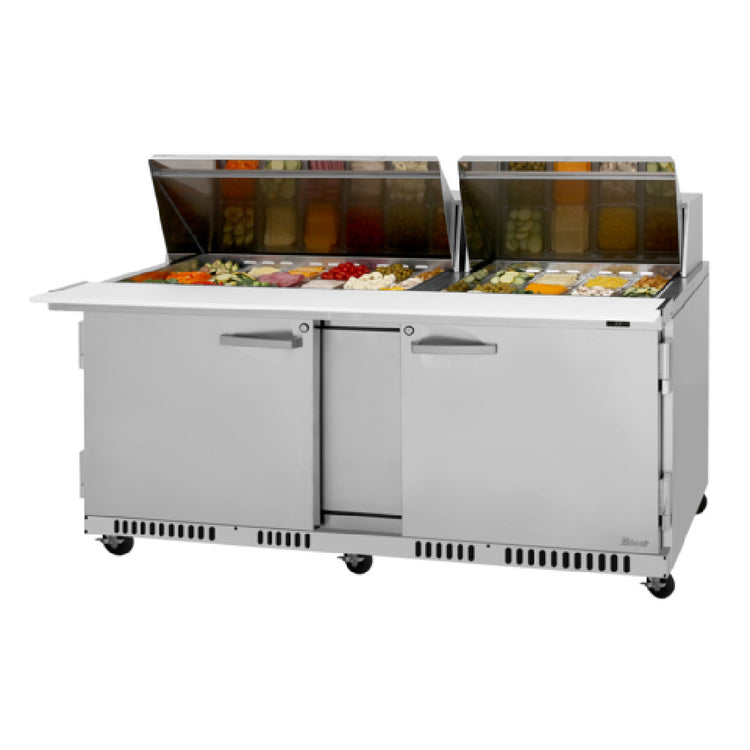 The Turbo Air PST-72-30-FB-N PRO Series Mega Top Sandwich/Salad Prep Table is a high-performance unit designed with front breathing airflow, optimizing space utilization and efficiency in any commercial kitchen setting. This two-section prep table offers a substantial capacity of 17.6 cubic feet, making it suitable for busy food service operations. With dimensions of 72-5/8 inches in width, 34 inches in depth, and 39-1/8 inches in height, it provides ample prep space with a stainless steel top that accommodates a 30-pan opening. The unit features two solid hinged swing doors, each equipped with locks to ensure the security of stored ingredients. Both the interior and exterior boast high-quality stainless steel construction with a galvanized steel bottom, ensuring durability and longevity. A standout feature is the self-cleaning condenser that reduces maintenance demands. Utilizing R290 Hydrocarbon refrigerant, this prep table is environmentally friendly and efficient. Powered by a 2/5 HP motor, it operates at 115v/60/1-ph with a current draw of 5.7 amps, and it comes with a NEMA 5-15P plug. Certified by cETLus and ETL-Sanitation, this unit emphasizes safety and sanitation standards and is proudly made in the USA, underscoring its reliability and quality craftsmanship.