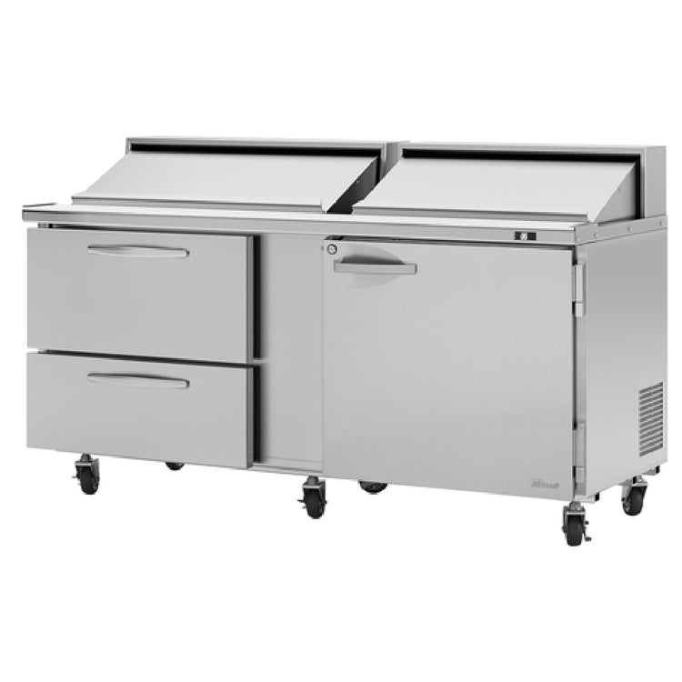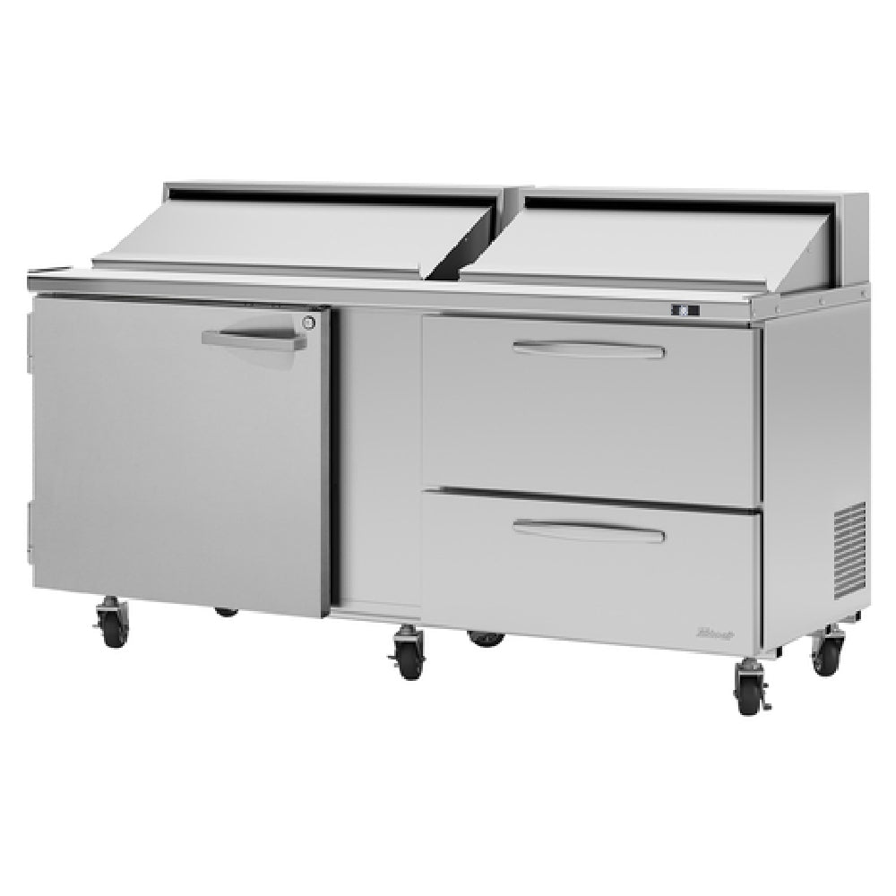 The Turbo Air PST-72-D2R(L)-N PRO Series Sandwich/Salad Unit is a versatile, high-capacity refrigeration solution designed for commercial kitchens. With a two-section design featuring a rear mount self-contained compressor, this unit offers a total of 23 cu.ft. of refrigerated space, making it an excellent choice for restaurants, delis, and catering services. Its dimensions are 72-5/8"W x 30"D x 37-5/8"H, providing ample storage while fitting seamlessly into various layouts. The unit comes equipped with an 18-pan top opening, complete with two hoods, and includes a solid hinged swing door with a lock for security. The aluminum door liner, coupled with a stainless steel shelf and two drawers, ensures durability and easy maintenance. Featuring a 9-1/2" deep cutting board with a side rail, its design is functional and efficient for food preparation. The digital temperature control and monitor system, along with the cold bunker system, guarantee consistent cooling, supported by the environmentally friendly R290 Hydrocarbon refrigerant. The interior and exterior are crafted from stainless steel with a galvanized bottom, ensuring longevity. With LED interior lighting, fan control, and a self-cleaning condenser, this unit operates on 115v/60/1-ph, drawing 9.9 amps, and is certified by cETLus and ETL-Sanitation. Made in the USA, it exemplifies quality and reliability.