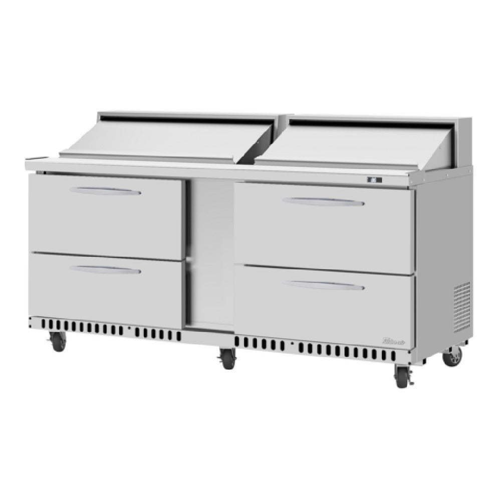 The Turbo Air PST-72-D4-FB-N PRO Series Mega Top Sandwich/Salad Prep Table - Front Breathing Airflow is a premium solution for efficient food preparation, catering to diverse needs within the commercial kitchen industry. This robust two-section unit boasts a generous capacity of 17.6 cubic feet, with dimensions of 72-5/8 inches in width, 30 inches in depth, and 37-5/8 inches in height, making it a spacious choice for storage and prep. The stainless steel top features an 18-pan opening, allowing for streamlined sandwich and salad assembly. With stainless steel interior and exterior complemented by a galvanized steel bottom, the table exemplifies durability and ease of maintenance. It incorporates four convenient drawers for organized storage. Its self-cleaning condenser utilizes R290 Hydrocarbon refrigerant, demonstrating a commitment to environmentally conscious technology with its 3/8 HP power. Operating at 115 volts and 9.9 amps, it is designed for efficiency and comes equipped with a NEMA 5-15P plug. Certified by cETLus and ETL-Sanitation, the Turbo Air prep table ensures compliance with rigorous safety and sanitation standards. Proudly made in the USA, this prep table is an optimal choice for businesses seeking reliability and performance in food preparation environments.