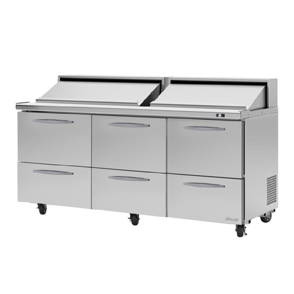 The Turbo Air PST-72-D6-N PRO Series Sandwich/Salad Unit Three-section Rear Mount Self-contained Compressor is a high-performance refrigeration solution designed for professional kitchen environments. With a spacious capacity of 23.0 cubic feet, it measures 72-5/8 inches in width, 30 inches in depth, and 37-5/8 inches in height. The unit features an 18-pan top opening, protected by two hoods, and includes six drawers for ample storage. A 9-1/2 inch deep cutting board with a side rail enhances its functionality. Equipped with a digital temperature control and monitor system, it ensures precise cooling, further supported by a cold bunker system. Constructed from stainless steel, both the interior and exterior boast durability, while a galvanized bottom offers added resilience. The self-cleaning condenser is a standout feature, ensuring maintenance is seamless. Utilizing R290 Hydrocarbon refrigerant, the unit operates with a 3/8 HP compressor, running on 115v/60/1-ph with a 9.9 amp draw. It is compliant with cETLus and ETL-Sanitation standards, and proudly made in the USA. This sandwich/salad unit is a reliable choice for various market segments, promising efficiency, durability, and superior refrigeration performance.