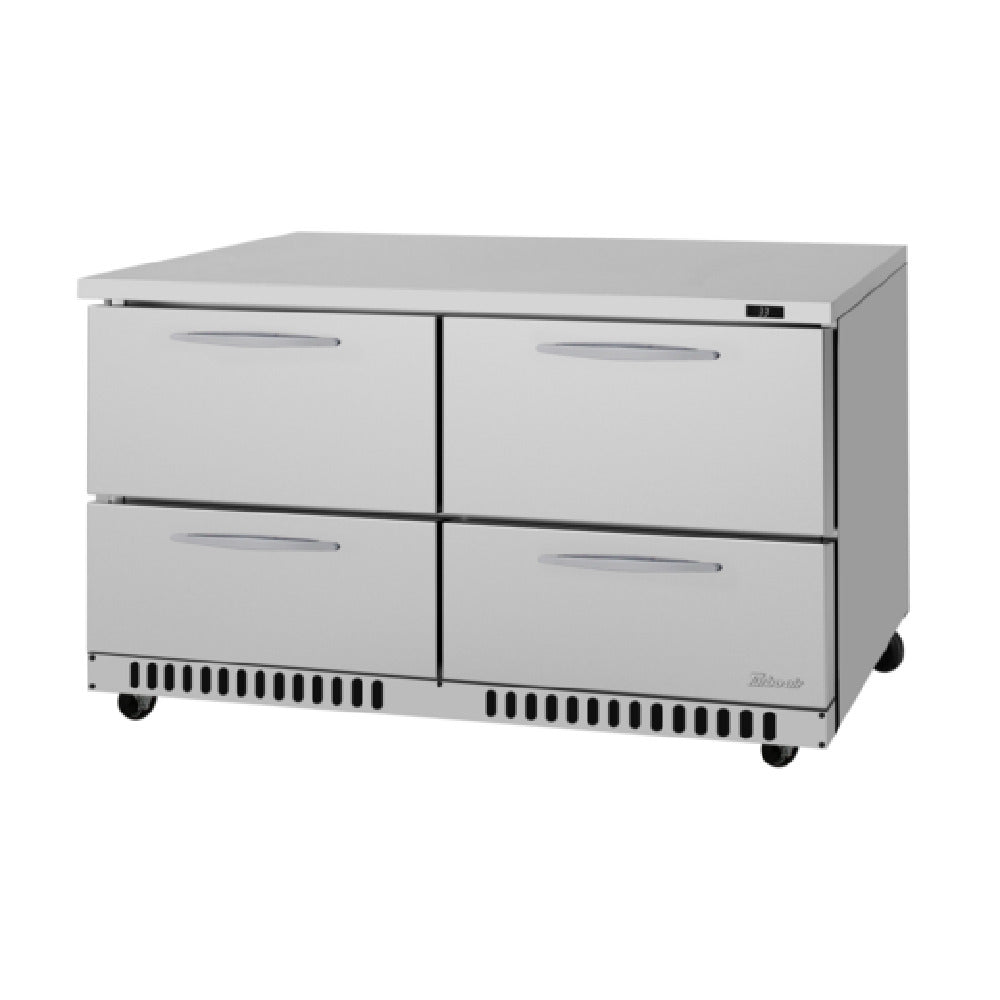 The Turbo Air PUR-60-D4-FB-N PRO Series Undercounter Refrigerator with front breathing airflow is a two-section unit designed for efficiency and versatility in commercial settings. With a storage capacity of 14.8 cubic feet, this refrigerator boasts dimensions of 60-1/4 inches wide, 30 inches deep, and 30 inches high, making it a compact yet powerful addition to any kitchen. It features four stainless steel drawers, providing easy access and organization, while the interior and exterior are crafted from durable stainless steel, complemented by a galvanized steel bottom for added strength. The self-cleaning condenser is an innovative feature that reduces maintenance needs and enhances reliability. Powered by a 1/6 horsepower compressor, the unit uses R290 Hydrocarbon refrigerant, aligning with environmentally friendly standards. Operating at 115v/60/1-ph and drawing 8.9 amps, the refrigerator is equipped with a NEMA 5-15P plug for straightforward installation. Certified by cETLus and ETL-Sanitation, it meets rigorous safety and sanitation standards, and is proudly made in the USA. This refrigerator is ideal for diverse market segments, including restaurants, cafes, and catering businesses, that require a reliable, high-performance refrigeration solution to enhance their operations.