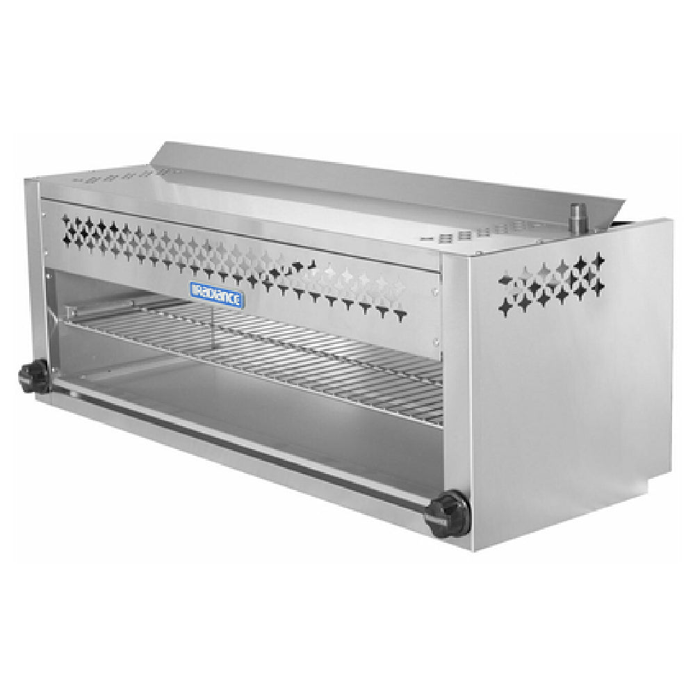 The Turbo Air TACM-48 Radiance Cheesemelter is a gas-operated unit that combines efficiency with durable construction, ideal for commercial kitchens looking to enhance their cooking processes. With a width of 48 inches, this cheesemelter is designed for either range or wall mounting, providing flexibility in kitchen arrangements. It features an adjustable gas valve that allows precise control of the infra-red burner, delivering a powerful 40,000 BTU for consistent heat distribution. The interior is equipped with a chrome-plated rack, ensuring easy cleaning and high resistance to corrosion. Its exterior, composed of a stainless-steel front, sides, and interior, guarantees long-lasting durability and a sleek appearance that fits seamlessly into any professional kitchen setting. The Turbo Air TACM-48 Radiance Cheesemelter is recognized for its quality with CSA and CSA-Sanitation certifications, meeting rigorous safety and sanitation standards. This product is particularly valuable for food service operations that require quick and efficient melting of cheese and other toppings, contributing to faster service times and satisfied customers. Its combination of robust performance and practical design makes it a versatile tool for various segments within the food industry, from bustling restaurants to catering services.
