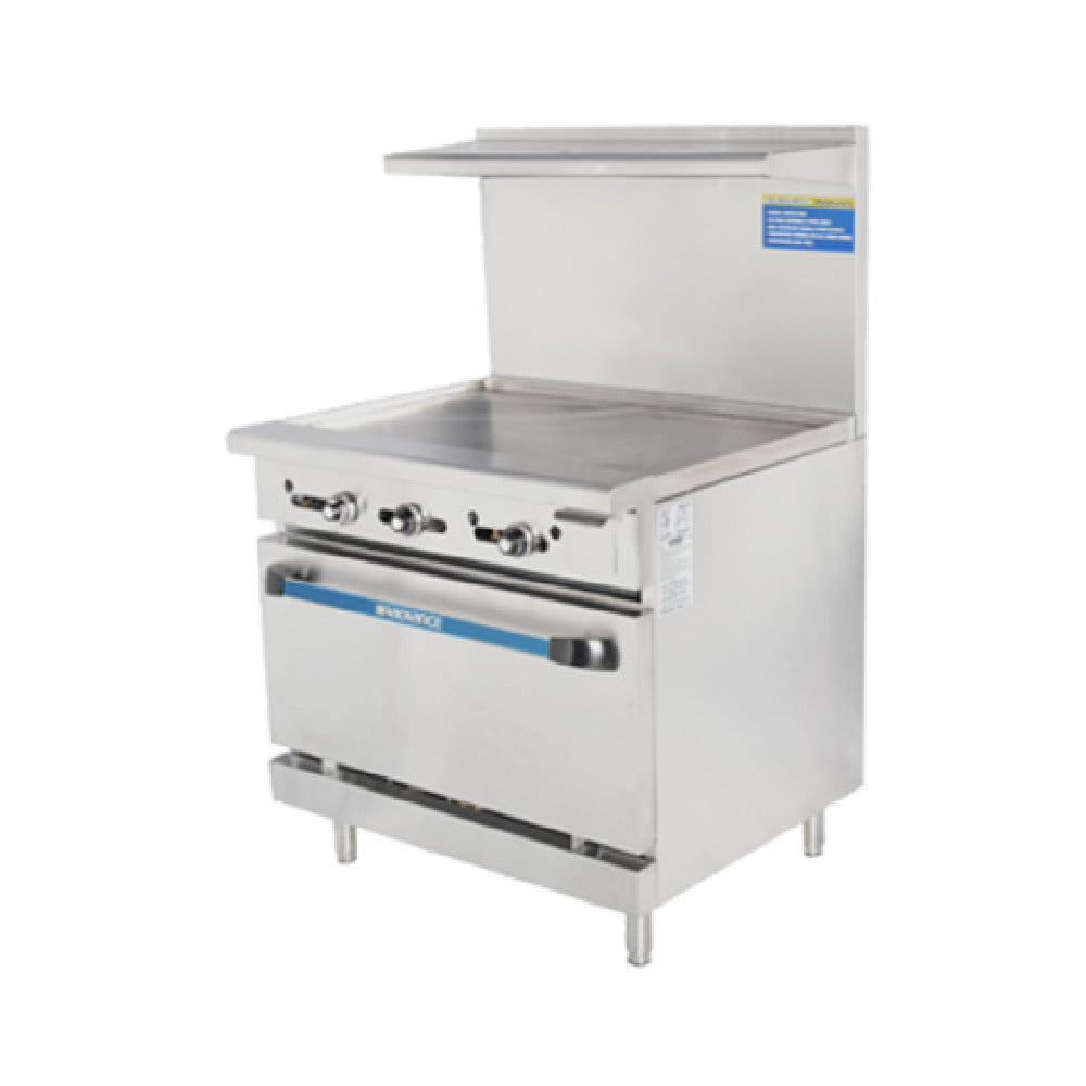 The Turbo Air TAR-36G_NAT Radiance Heavy Duty Range - natural gas, 36" is a top-tier choice for commercial kitchens aiming to enhance efficiency and performance. This range features a thermostatically controlled griddle, ensuring precise temperature management for consistent cooking results. Its high-efficiency griddle is engineered to provide faster cooking and rapid recovery while consuming less gas, making it both economical and environmentally friendly. The unit is constructed with a stainless steel front, sides, and back riser, featuring a lift-off high shelf for added convenience. The interior of its standard oven base measures 26.3" D, providing ample space for various cooking needs. It includes a crumb tray, enhancing ease of maintenance. The oven's thermostat is fully adjustable, allowing for temperatures ranging from 250°F to 550°F, accommodating a wide array of cooking techniques. Delivering a total output of 94,000 BTU, it stands as a powerful addition to any culinary environment. Supported by sturdy 6" stainless steel legs, this range is built for durability and stability. Certified by CSA, CSA Flame, CSA Star, and CSA-Sanitation, the Turbo Air TAR-36G_NAT ensures compliance with rigorous safety and sanitation standards, making it an ideal choice for restaurants, catering facilities, and other food service operations.