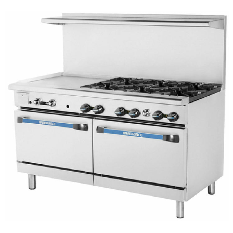 The Turbo Air TARG-24G6B_NAT Radiance Restaurant Range Gas 60" is a powerful and versatile choice for commercial kitchens, featuring six 32,000 BTU open burners and a 24" griddle on the left side, catering to diverse culinary needs. The range includes two standard ovens, each equipped with one rack, offering ample cooking space and flexibility. Constructed with full stainless steel for the front, sides, back riser lift-off high shelf, and oven interior, it ensures durability and easy maintenance. The oven thermostat is adjustable, providing precise temperature control for various cooking applications. Measuring 26.3" in depth, it fits seamlessly into kitchen layouts, supported by standard 6" stainless steel adjustable legs for stability and height customization. With a total output of 299,000 BTU, the Turbo Air TARG-24G6B_NAT delivers exceptional performance and efficiency. A regulator is included to maintain consistent gas flow, ensuring optimal functionality. This range holds CSA, CSA Flame, CSA Star, and CSA-Sanitation certifications, underscoring its compliance with rigorous safety and sanitation standards. Suitable for a wide range of food service establishments, from bustling restaurants to catering operations, this gas range offers a blend of robust performance, reliability, and practicality.