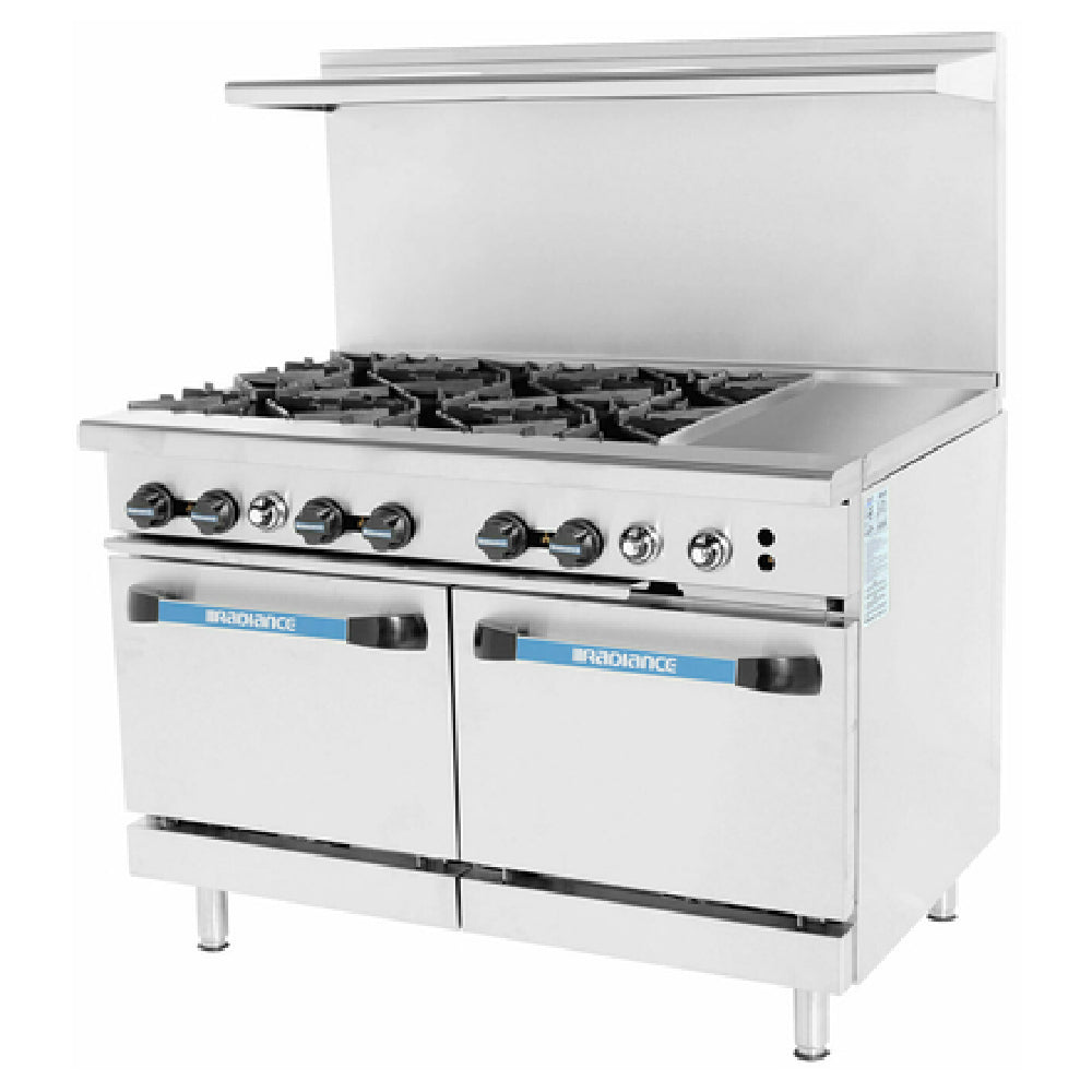 The Turbo Air TARG-6B12G_LP Radiance Restaurant Range is a gas-powered kitchen appliance designed to meet the rigorous demands of the foodservice industry. It features a 48-inch configuration, incorporating six open burners, each delivering 32,000 BTUs, ensuring high-powered and efficient cooking suitable for a wide array of culinary tasks. Complementing these burners is a 12-inch griddle placed on the right side, offering additional versatility for chefs who require multiple cooking options within a single unit. The range also includes two standard ovens, each equipped with one rack, making it suitable for baking and roasting needs. The stainless steel construction graces the front, sides, and back riser, while an easily detachable high shelf extends its utility. The full stainless steel oven interior and adjustable thermostat cater to precise temperature control and durability. With a depth of 26.3 inches and adjustable 6-inch stainless steel legs, this unit is adaptable to various kitchen layouts. Its built-in regulator ensures efficient gas flow management, contributing to the range's overall output of 284,000 BTUs. This product is CSA certified across multiple categories - Flame, Star, and Sanitation - highlighting its compliance with safety and quality standards for professional kitchens.