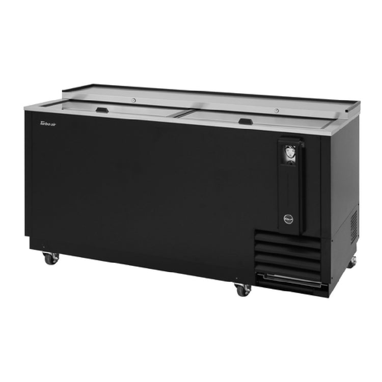 The Turbo Air TBC-65SB-N6 Super Deluxe Bottle Cooler is a high-performance refrigeration unit designed to meet the diverse needs of commercial establishments. With dimensions of 64-3/8" width x 26-1/2" depth x 33-1/4" height and a spacious 18.5 cu.ft. capacity, it provides ample storage for bottled beverages. This bottle cooler is equipped with a self-cleaning condenser, ensuring efficient operation and reduced maintenance efforts. Its self-contained refrigeration system utilizes R600a Hydrocarbon refrigerant, powered by a 1/5 HP side mount compressor, and operates at 115v/60/1-ph, drawing 1.7 amps through a NEMA 5-15P plug. The cooler features four PE coated adjustable dividers, allowing for flexible organization of contents. A built-on removable bottle cap opener and catcher add convenience for fast-paced service environments. The design includes two sliding lids, enhancing accessibility while maintaining temperature control. The unit is robustly constructed with a stainless steel countertop and lid, stainless steel inside walls and floor, and a black laminated exterior, with a galvanized steel interior top for durability. Front breathing and mounted on five casters, it offers mobility and placement flexibility. Certified by cETLus and ETL-Sanitation, it ensures compliance with industry standards, making it a reliable choice for bars, restaurants, and other venues requiring efficient beverage cooling solutions.