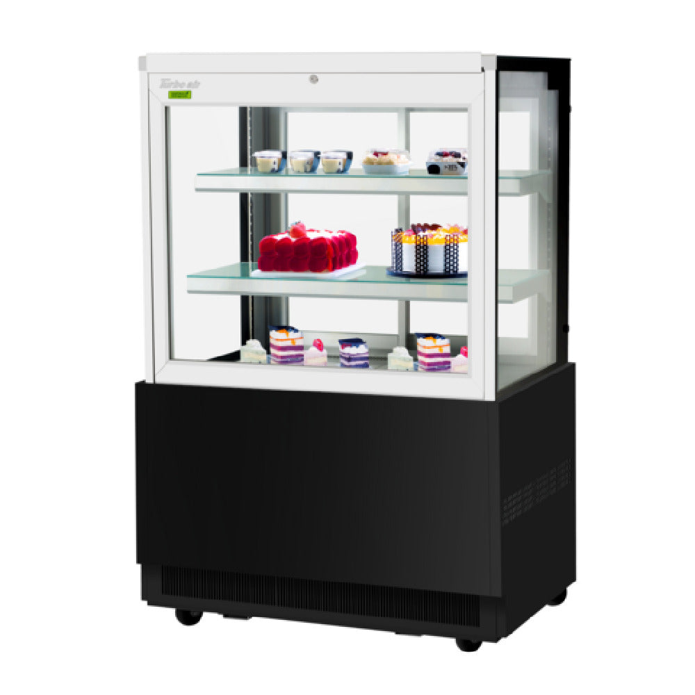 The Turbo Air TBP36-54FN_WH Refrigerated Bakery Display Case is a versatile, compact solution perfect for showcasing baked goods in a professional setting. With dimensions of 35-3/8"W x 27-1/2"D x 51-7/8"H and a spacious 12.5 cubic feet capacity, it is equipped with a self-contained refrigeration system featuring a self-cleaning condenser. This ensures efficient and reliable operation, crucial for maintaining the quality of perishable goods. The display case includes a front glass opening and tempered glass side panels, offering excellent visibility for displayed items. Its sliding rear doors provide easy access for staff, while the digital temperature controller allows precise adjustments to suit different requirements. The unit features two adjustable tempered glass shelves with aluminum front and back edges, allowing customization of display configuration. LED interior lighting enhances product visibility, offering an attractive presentation to customers. The case operates with environmentally-friendly R290 Hydrocarbon refrigerant and is powered by a 1/3 HP motor, requiring 115v/60/1-ph with 7.0 amps. Mobility is facilitated by 3" swivel casters, with rear locking for stability. This model supports customization with a choice of exterior colors and includes a cord with NEMA 5-15P, meeting cETLus and ETL-Sanitation standards, making it a valuable asset in any bakery or retail environment.