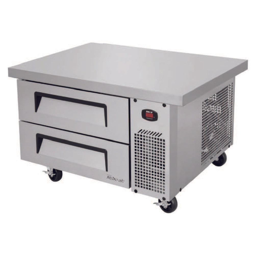 The Turbo Air TCBE-36SDR-E-N6 Super Deluxe Extended Top Chef Base Refrigerator is a compact yet highly efficient refrigeration unit, measuring 41-5/8" wide, 32" deep, and 20-1/4" high. It boasts a 4.98 cu. ft. capacity, making it an ideal choice for professionals in culinary environments where space and performance are equally crucial. This refrigerator features a side-mounted, self-contained refrigeration system enhanced by a self-cleaning condenser device, ensuring longevity and reduced maintenance. Its storage is optimized with two durable drawers featuring recessed handles, each accommodating one full-size pan and three 1/6 size pans, up to 6" deep, though pans are not included. The unit is constructed with 16 gauge stainless steel, including a one-piece reinforced insulated top, providing durability and maintaining consistent temperatures. The digital temperature display allows for precise monitoring, while the use of R600a Hydrocarbon refrigerant underscores its commitment to environmental sustainability. With a 1/5 HP motor, operating at 115v/60/1-ph and 2.8 amps, it is equipped with a NEMA 5-15P plug for easy integration into most kitchen electrical setups. Certified by cETLus and ETL-Sanitation, this refrigerator is a reliable, high-performance choice for the foodservice industry, ensuring quality and compliance with health standards.