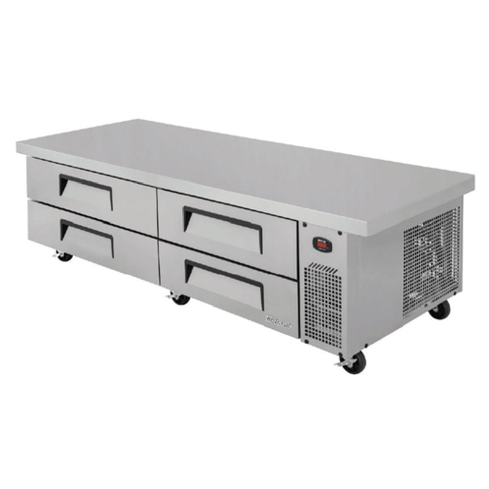 The Turbo Air TCBE-82SDR-E-N Super Deluxe Extended Top Chef Base Refrigerator is a high-capacity refrigeration unit designed for professional kitchens, measuring 89-1/2"W x 32"D x 20-1/4"H. It offers a substantial 16.04 cu. ft. of storage space, facilitated by a side-mounted self-contained refrigeration system. This unit features a self-cleaning condenser device, enhancing longevity and performance. Constructed with a 16 ga. stainless steel one-piece reinforced insulated top, it ensures durability and robust support for kitchen operations. The refrigerator is equipped with (4) durable drawers with recessed handles, accommodating pans up to 6" deep. It has a versatile capacity - (3) full-size pans per drawer on the left side (top & bottom) and (2) full-size pans per drawer on the right side (top & bottom). The front and sides are constructed of stainless steel, providing a sleek, professional aesthetic. The unit uses R290 Hydrocarbon refrigerant and operates with a 1/3 HP motor on a 115v/60/1-ph electrical system, drawing 6.2 amps and is fitted with a NEMA 5-15P plug. It is cETLus and ETL-Sanitation certified, ensuring compliance with industry standards, making it an excellent choice for demanding culinary environments where efficiency and reliability are paramount.