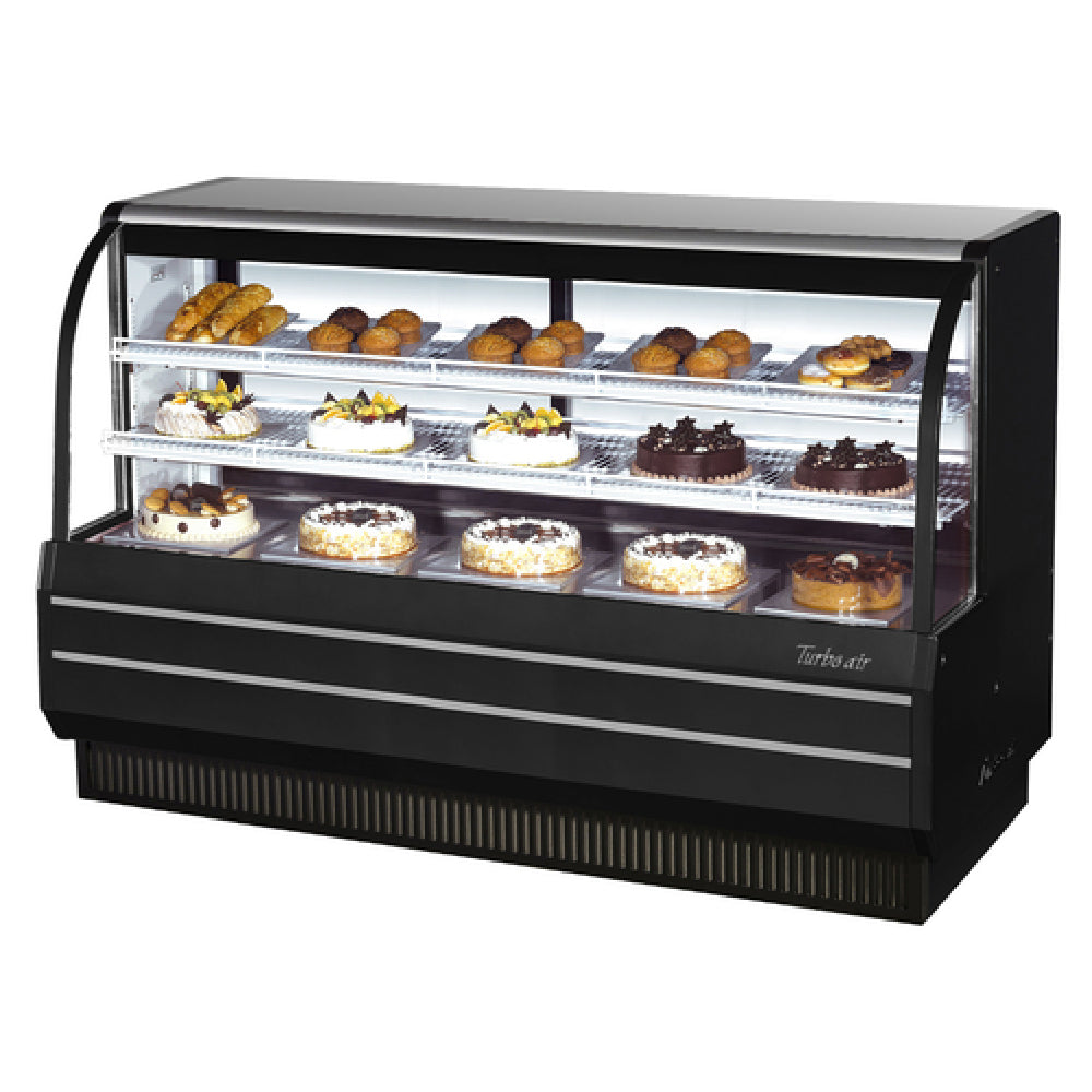 Turbo Air TCGB-72-W-N Refrigerated Bakery Display Case 72 1/2" W 23.2 Cu.ft. Self-contained Refrigeration With Self-cleaning Condenser Curved Front Tempered Glass