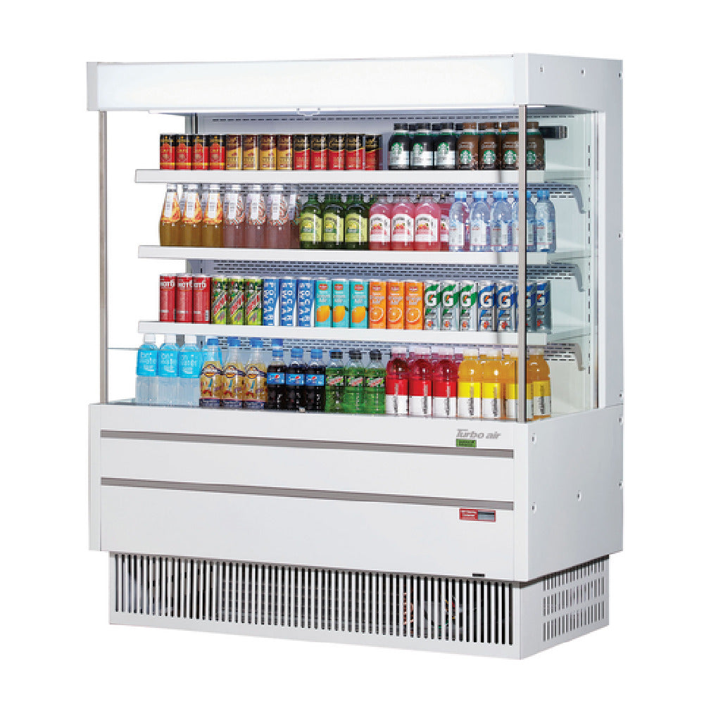 The Turbo Air TOM-50MSEW(B)-N Vertical Air Curtain Open Display Merchandiser is a medium-height refrigeration unit with a 13.8 cubic foot capacity, ideal for showcasing products in a visually appealing way. Measuring 51-5/8 inches in width, 25-3/4 inches in depth, and 60-3/4 inches in height, this merchandiser is designed to fit seamlessly into various retail environments. It features self-contained refrigeration with a self-cleaning condenser, ensuring efficient and reliable operation. The interior is illuminated with LED lighting, highlighting products prominently across the three adjustable shelves. For added functionality, it includes a night curtain, front air intake, and rear air discharge. The interior is finished in white, and the exterior color can be specified to match your store's aesthetic. Utilizing R290 Hydrocarbon refrigerant, the unit is environmentally friendly with two 3/4 horsepower motors. The merchandiser operates on a 115v/60/1-phase electrical supply drawing 15.5 amps, and includes a cord with NEMA 5-20P plug for easy installation. Certified by cETLus and ETL-Sanitation, this merchandiser meets high standards of safety and sanitation, making it a dependable choice for grocery stores, cafes, and other food service providers looking to enhance product presentation and accessibility.