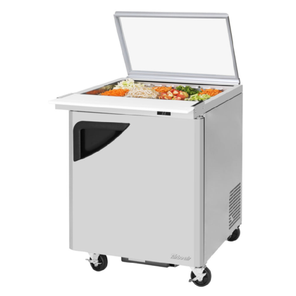 The Turbo Air TST-28SD-12-N-GL Super Deluxe Sandwich/Salad Mega Top Unit With Glass Lid is a compact yet efficient solution for commercial kitchens, particularly in deli and salad preparation settings. Measuring 28 inches wide, 37 inches deep, and 31-3/4 inches high, this one-section unit offers a spacious 8 cu. ft. interior. It features a stainless steel top that accommodates a 12-pan opening, enhancing its utility in high-volume food service environments. The unit is equipped with a single stainless steel door with recessed handles and a stainless steel wire shelf, promoting easy access and organization. Its self-cleaning condenser and cold air compartment are integral to maintaining optimal temperature and hygiene standards. The LED interior lighting combined with fan control ensures proper visibility and efficient cooling. The cold bunker system, along with the self-contained rear-mounted refrigeration system, utilizes R290 Hydrocarbon refrigerant, which is eco-friendly and efficient. With 1/6 HP and operating on 115v/60/1-ph, it draws 6.6 amps, fitting a NEMA 5-15P plug, making it a practical choice for a variety of kitchen layouts. Certified by ETL-Sanitation and cETLus, and made in the USA, this unit embodies quality and reliability in professional culinary applications.