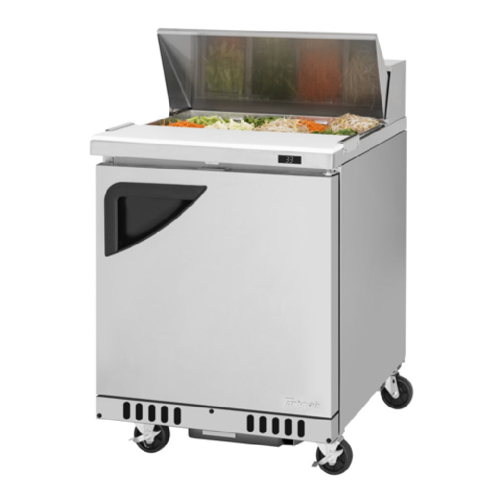 The Turbo Air TST-28SD-FB-N Super Deluxe Sandwich/Salad Unit is a high-performance refrigeration solution designed for professional kitchens and food service environments. With a compact design measuring 27-1/2"W x 30"D x 37"H, this unit offers a storage volume of 6.5 cubic feet. The stainless steel construction, encompassing both the interior and exterior, with a galvanized steel back and bottom, ensures durability and ease of maintenance. This unit is equipped with a single stainless steel door featuring a recessed handle and an ABS door liner for enhanced insulation. It includes an 8-pan opening on its stainless steel top and an insulated pan cover, making it ideal for sandwich and salad preparation. The cold air compartment and self-cleaning condenser enhance the cooling efficiency, while the hot gas condensate system ensures optimal functionality. Powered by a 1/5 HP motor, it runs at 115v/60/1-ph with an energy draw of 3.8 amps, and comes with a NEMA 5-15P plug. Utilizing R290 Hydrocarbon refrigerant, this unit aligns with modern environmental standards. The front breathing airflow design complements its self-contained rear mounted refrigeration system, making it a versatile and reliable choice for various culinary applications. Certified by cETLus and ETL-Sanitation, it meets rigorous safety and sanitation standards.