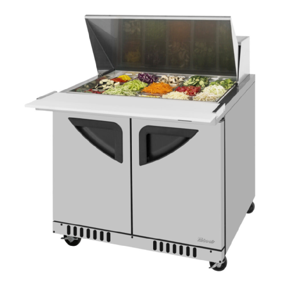 The Turbo Air TST-36SD-15-FB-N Super Deluxe Sandwich/Salad Mega Top Unit is engineered for efficiency and durability, featuring a front breathing airflow system that optimizes space usage in compact settings. This two-section unit, with dimensions of 36-1/4"W x 34"D x 39"H, offers a total capacity of 8.8 cubic feet, providing ample storage for a variety of ingredients. The stainless steel construction, both interior and exterior, ensures longevity and easy maintenance, complemented by a galvanized steel back and bottom. Designed for functionality, it includes a stainless steel top with a 15-pan opening, allowing for convenient ingredient access. The unit is equipped with two solid hinged swing doors and a cutting board side rail for enhanced user experience. Its self-cleaning condenser utilizes R290 Hydrocarbon refrigerant, promoting eco-friendly operation with a 1/5 HP motor. Running on 115v/60/1-ph with a 3.8 amp draw and using a NEMA 5-15P plug, this unit is cETLus and ETL-Sanitation certified. Ideal for delis, sandwich shops, and similar establishments, the Turbo Air TST-36SD-15-FB-N combines practical design with robust performance, making it a reliable asset for commercial food preparation environments.