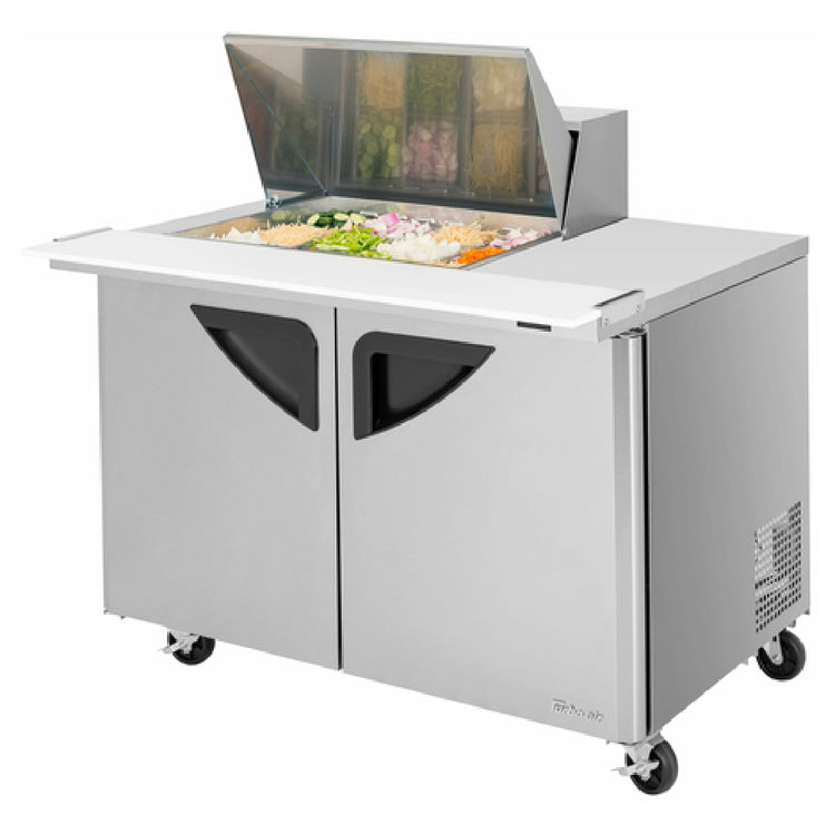 The Turbo Air TST-48SD-12M-N(-LW) Super Deluxe Sandwich/Salad Mega Top Unit - two-section - is a powerful refrigeration solution, designed to enhance the efficiency and productivity of commercial kitchens. Featuring a generous capacity of 15.0 cubic feet, this unit is equipped with a stainless steel top that includes a 12-pan opening, effectively optimizing ingredient organization and accessibility. The unit showcases two stainless steel doors with recessed handles and an ABS door liner, adding to its robust and durable construction. Inside, the unit contains two stainless steel shelves and a cold air compartment, ensuring superior cooling performance. Its insulated pan cover, coupled with a 9-1/2"D cutting board, offers practical convenience for prep work. The digital temperature control and monitoring system, along with LED interior lighting and fan control, facilitate precise temperature management. Constructed with both a stainless steel interior and exterior, and a galvanized steel back and bottom, this unit is mounted on 5-3/8"H casters for mobility. With a self-cleaning condenser, utilizing R290 Hydrocarbon refrigerant, and powered by a 1/5 HP motor, this unit operates on 115v/60/1-ph, drawing 6.5 amps via a NEMA 5-15P plug. The TST-48SD-12M-N(-LW) is cETLus and ETL-Sanitation certified, made in the USA, with a 4-week lead time for TST-DS models.