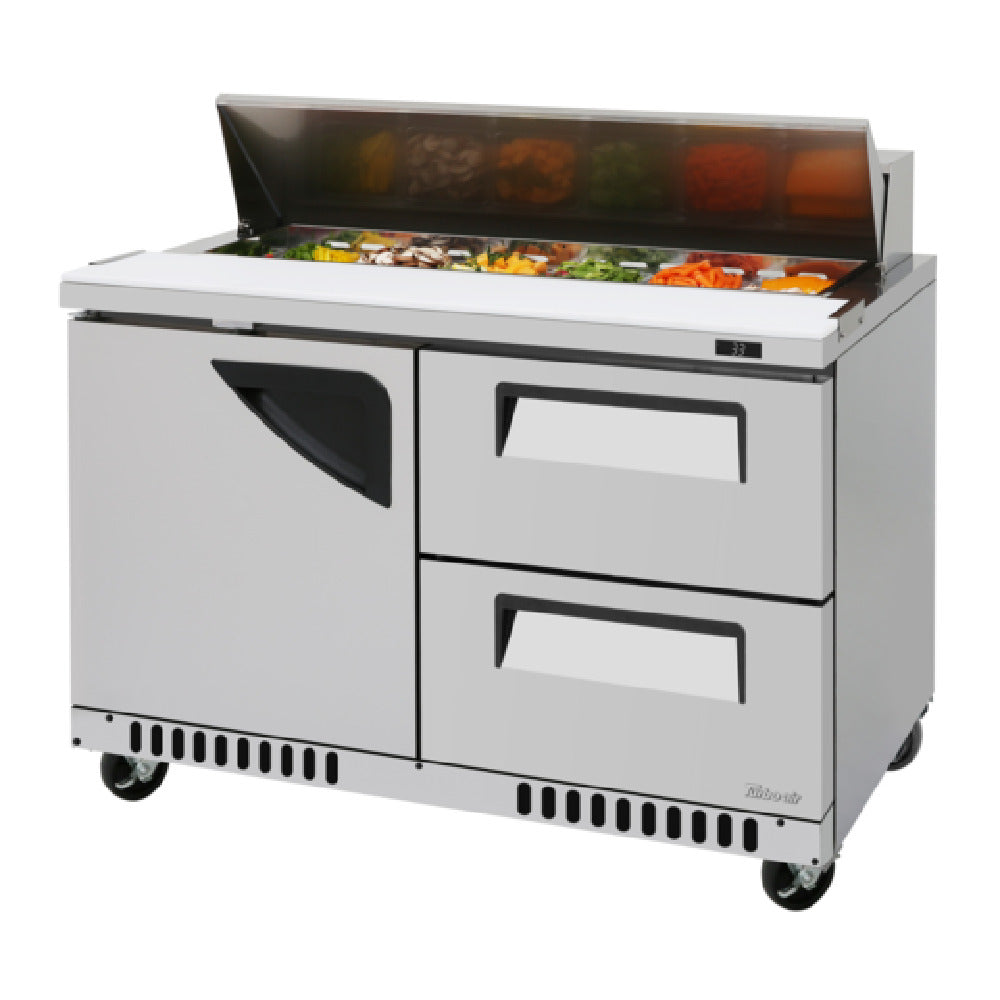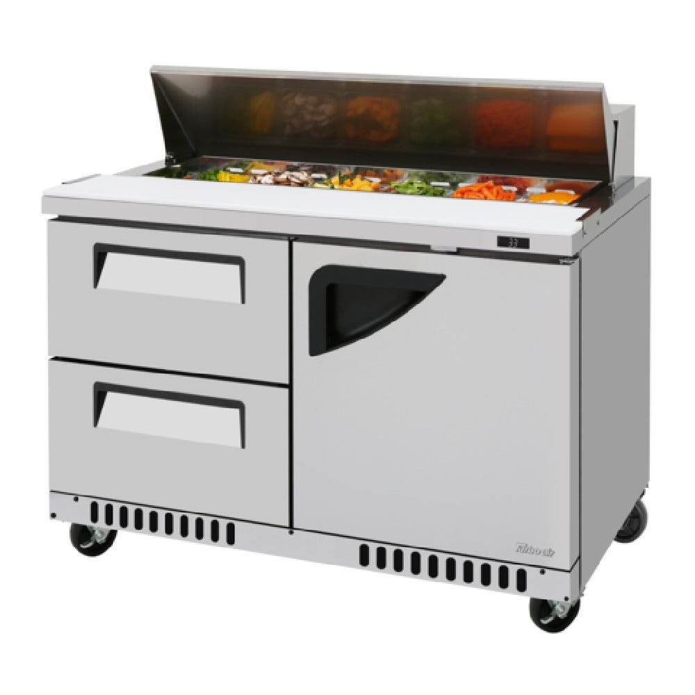 The Turbo Air TST-48SD-D2R(L)-FB-N Super Deluxe Sandwich/Salad Unit - Front Breathing Airflow is an advanced refrigeration solution engineered for precision and efficiency in commercial kitchens. Featuring a two-section design, this unit offers a substantial capacity of 11.1 cubic feet, supporting diverse culinary operations. With dimensions of 48-1/4 inches in width, 30 inches in depth, and 37 inches in height, it fits seamlessly into various kitchen layouts. The stainless steel top is equipped with a 12-pan opening, complemented by one stainless steel door and two drawers for optimal storage versatility. Its interior and exterior are crafted from stainless steel, with a galvanized steel back and bottom, ensuring durability and ease of maintenance. The inclusion of a self-cleaning condenser enhances operational efficiency and reliability. A stainless steel wire shelf, cutting board side rail, and the use of R290 Hydrocarbon refrigerant highlight its thoughtful design and eco-friendly operation. Powered by a 1/5 HP motor, it operates on 115v/60/1-ph with a 6.5 amp draw and is compatible with a NEMA 5-15P plug. Certified by cETLus and ETL-Sanitation, this unit represents a sophisticated blend of functionality and compliance, catering to the needs of the food service industry.