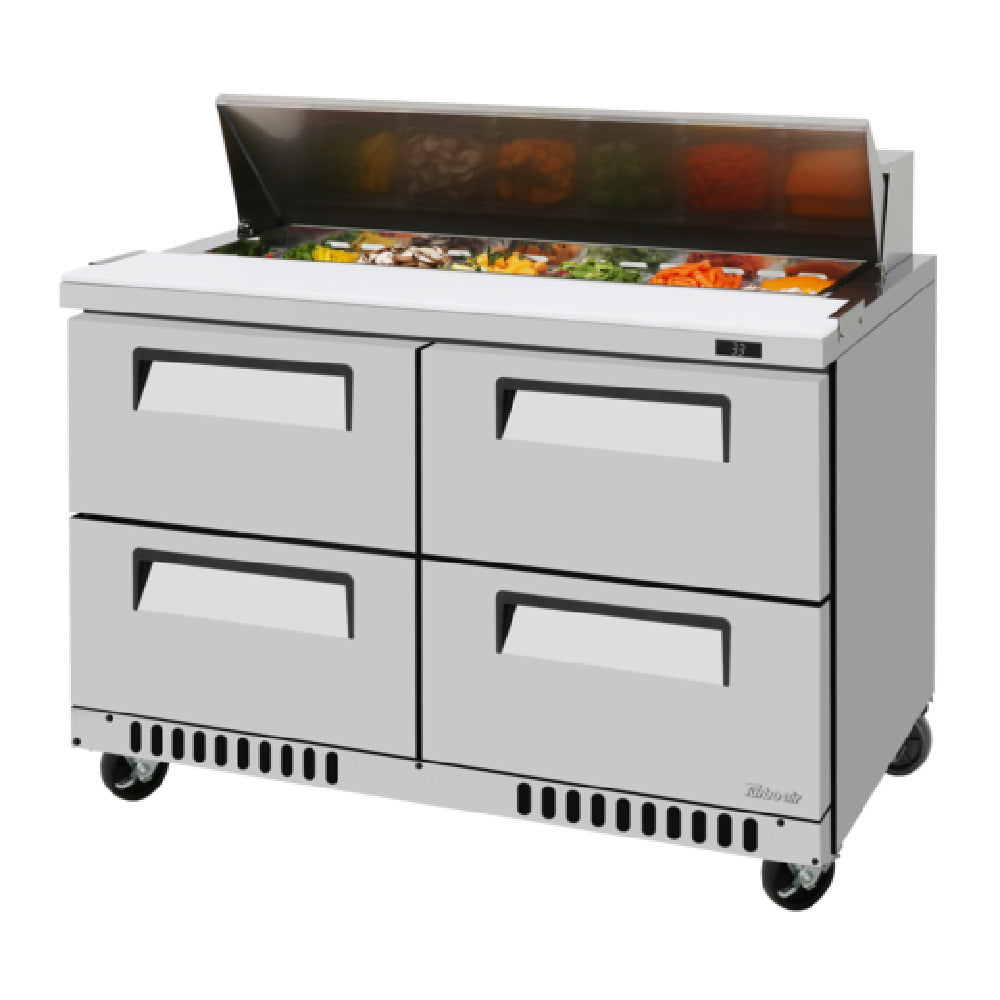The Turbo Air TST-48SD-D4-FB-N Super Deluxe Sandwich/Salad Unit - Front Breathing Airflow stands out with its advanced design and robust functionality, making it an essential asset for any commercial kitchen focused on efficiency and quality. This two-section unit offers a generous 11.1 cubic feet of storage space, with dimensions of 48-1/4" W x 30" D x 37" H, providing ample room for ingredients and supplies. The stainless steel top features a 12-pan opening, supported by four durable drawers, ensuring organized storage. Crafted with a stainless steel interior and exterior, along with a galvanized steel back and bottom, the unit promises long-lasting durability and an appealing aesthetic. The self-cleaning condenser technology ensures maintenance is minimal, maximizing operational uptime. Its front breathing airflow design is ideal for establishments needing flexible installation options. Operating efficiently with R290 Hydrocarbon refrigerant, powered by a 1/5 HP motor, the unit connects easily with a 115v/60/1-ph, 6.5 amps power supply, using a NEMA 5-15P plug. Certified by cETLus and ETL-Sanitation, this unit meets rigorous safety and sanitation standards, making it a top choice for restaurants, delis, and cafes aiming to enhance their food preparation areas with a reliable, high-capacity refrigeration solution.