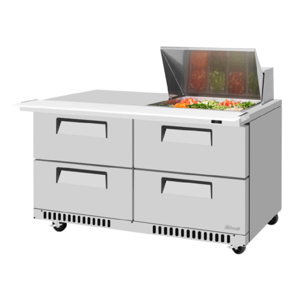 Turbo Air, TST-60SD-12M-D4-FB-N(-LW), Super Deluxe Series/Prep Table Workstation Drawers, two-section, front breathing airflow 60-1/4"W x 34"D x 39-5/8"H, 14.8 cu. ft., (12) 1/6 size 4" deep pans, (4) drawers, insulated pan cover, 9-1/2"D cutting board, digital temperature control & monitoring system, stainless steel interior & exterior (galvanized steel back & bottom), self-cleaning condenser equipped, High-density polyurethane insulation, cold bunker system, 1/5 HP, 115v/60/1 voltage, 8.9 amps, NEMA 5-15P, cETLus, ETL-Sanitation