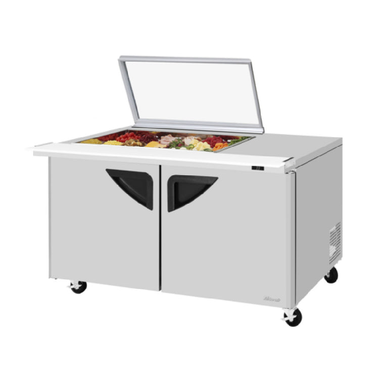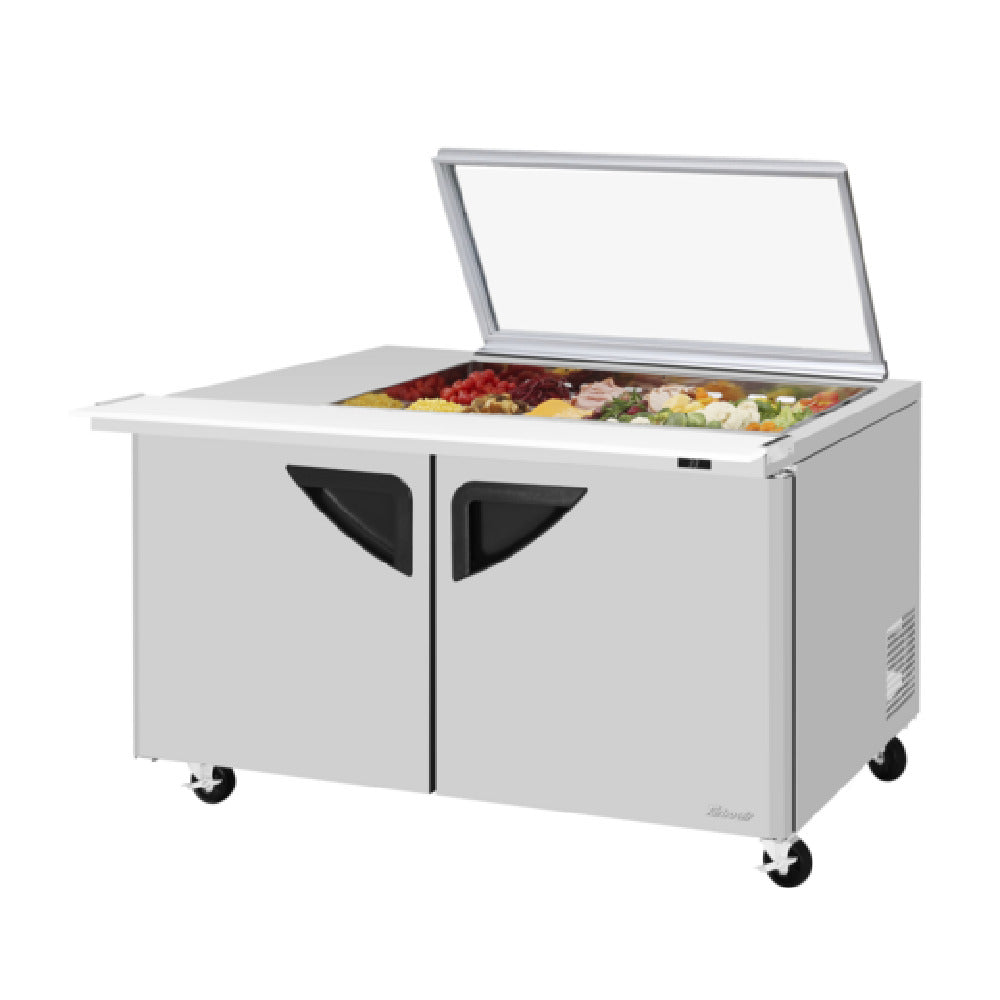 Turbo Air, TST-60SD-18M-N-GL(-LW), Super Deluxe Sandwich/Salad Mega Prep + Work Station, Glass Lid, specify side for work station, two-section, 19 cu. ft., 60-1/4"W x 36-3/4"D x 31-3/4"H, (18) 1/6 size x 4" deep pans, (2) solid doors, (2) stainless steel wire shelves, LED interior lighting & fan control, digital temperature control & monitor system, LED interior lighting & fan control, 6-1/4" deep cutting board, stainless steel interior (ABS door liner), stainless steel exterior (galvanized steel back & bottom), self-cleaning condenser, R290 Hydrocarbon refrigerant, 1/5 HP, 115v/60/1-ph, 8.9 amps, cord with NEMA 5-15P, ETL-Sanitation, cETLus, Made in USA