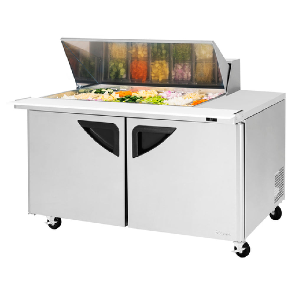 The Turbo Air TST-60SD-18M-N(-LW) Super Deluxe Sandwich/Salad Mega Top Unit with Undercounter is a versatile refrigeration solution, designed for optimal food preparation and storage in professional kitchen environments. With a spacious 19 cu. ft. capacity, this two-section unit features a width of 60-3/8 inches, a depth of 34 inches, and a height of 39 inches, making it a substantial addition to any food service operation. It accommodates up to 18 pans, each 1/6 size and 4 inches deep, providing ample space for ingredients. The unit includes two solid doors and two adjustable PVC-coated wire shelves, enhancing storage flexibility. Its digital temperature control and monitor system ensure precise temperature management, crucial for maintaining food safety standards. The Turbo Air TST-60SD-18M-N(-LW) is equipped with LED interior lighting and fan control for energy-efficient operation, while the insulated pan cover helps maintain optimal temperature conditions. A 9-1/2 inch deep and 1/2 inch thick cutting board with a convenient side rail is included, enhancing its utility as a workstation. Constructed with a stainless steel interior and exterior, the unit features a self-cleaning condenser and uses R290 Hydrocarbon refrigerant, underscoring its commitment to sustainability. Made in the USA, this unit operates on 115V/60/1-ph, drawing 4.4 amps, and includes a cord with NEMA 5-15P plug.