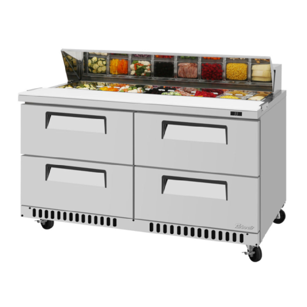 The Turbo Air TST-60SD-D4-FB-N Super Deluxe Series Undercounter Refrigerator - Front Breathing Airflow is a versatile appliance designed for efficiency and durability in commercial kitchen environments. With dimensions of 60-1/4 inches in width, 30 inches in depth, and 37 inches in height, this refrigerator offers a substantial storage capacity of 14.8 cubic feet. It features four robust drawers, providing ample space for organized storage. The refrigerator is constructed with a stainless steel interior and exterior, ensuring longevity and easy maintenance, while the back and bottom are made of galvanized steel. A standout feature is its self-cleaning condenser, which promotes optimal performance and reduces maintenance needs. Utilizing R290 Hydrocarbon refrigerant, this unit is environmentally friendly and energy-efficient. Powered by a 1/5 horsepower motor, it operates on 115 volts with an 8.9 amp draw, and includes a NEMA 5-15P plug for easy installation. With certifications from cETLus and ETL-Sanitation, it meets rigorous safety and sanitation standards, making it suitable for diverse market segments within the foodservice industry. Its front-breathing airflow design allows for flexible installation, even in tight spaces, enhancing its adaptability for various kitchen layouts.