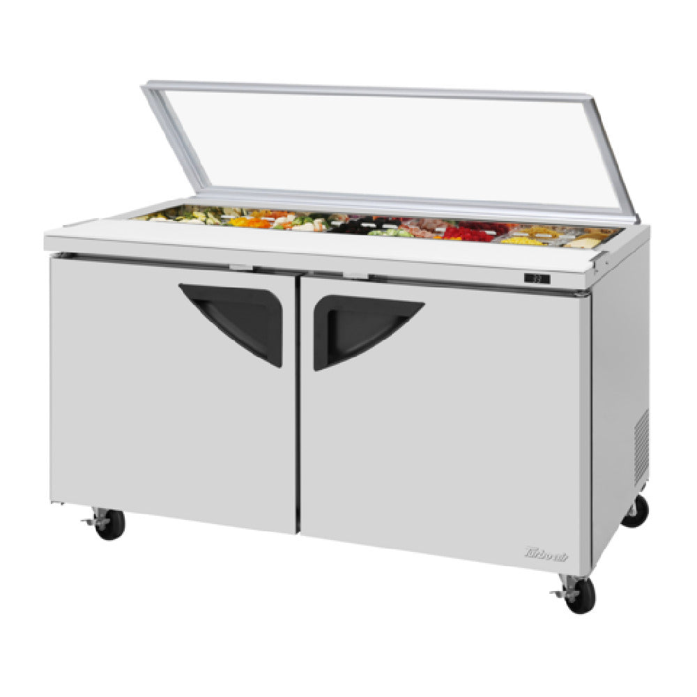 The Turbo Air TST-60SD-N-GL Super Deluxe Sandwich/Salad Unit With Glass Lid Two-section is an exceptional piece of equipment designed to address the diverse needs of the foodservice industry. With a spacious capacity of 16 cu. ft., it measures 60-1/4"W x 32-7/8"D x 31-3/4"H, accommodating 16 pans for efficient ingredient organization. This unit features two stainless steel doors with recessed handles, ensuring durability and ease of access. The stainless steel interior and exterior, complemented by a galvanized steel back and bottom, provide robust construction and longevity. An ABS door liner adds another layer of protection and insulation. Equipped with two stainless steel wire shelves, this model offers ample storage. Its innovative self-cleaning condenser enhances performance and efficiency, while the cold air compartment maintains optimal temperature. A 6-1/4" deep cutting board with a side rail is integrated for convenient food preparation. The self-contained rear-mounted refrigeration system, utilizing R290 Hydrocarbon refrigerant, operates with a 1/5 HP compressor on 115v/60/1-ph power, drawing 8.9 amps through a NEMA 5-15P plug. Certified by cETLus and ETL-Sanitation, and proudly made in the USA, this unit is a versatile asset for any food service environment, offering reliable performance and premium craftsmanship.