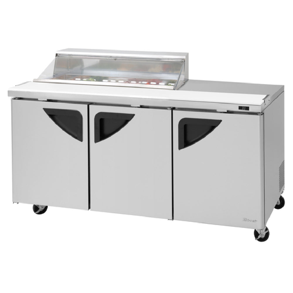 The Turbo Air TST-72SD-12S-N-CL Super Deluxe Sandwich/Salad Unit is a three-section refrigeration solution, measuring 72-5/8"W by 30"D by 37-5/8"H, and offering a spacious 23.0 cu. ft. of storage. This unit includes a clear top with a 12-pan opening, ideal for food service operations requiring efficient ingredient organization. It features three stainless steel doors with recessed handles, enhancing its durability and accessibility, while the ABS door liner and three stainless steel shelves contribute to its robust interior design. The cold air compartment ensures even temperature distribution, supported by digital temperature control and monitoring systems. A 9-1/2"D cutting board provides a practical prep area, complemented by LED interior lighting and fan control for enhanced visibility and operational efficiency. Constructed with stainless steel inside and out, including a galvanized steel back and bottom, this unit is equipped with 5-3/8"H casters for mobility. It features a self-cleaning condenser, utilizing R290 Hydrocarbon refrigerant with a 3/8 HP motor, operating at 115v/60/1-ph and 9.9 amps, with a NEMA 5-15P power plug. Certified by cETLus and ETL-Sanitation, and proudly made in the USA, this unit meets high standards of safety and reliability for diverse market segments within the food service industry.