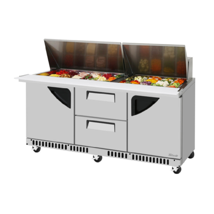 The Turbo Air TST-72SD-30-LD2R-FB-N Super Deluxe Sandwich/Salad Mega Top Unit is an innovative solution for food service environments requiring both functionality and efficiency. This three-section unit boasts a generous capacity of 17.6 cubic feet, with dimensions measuring 72-5/8 inches wide, 34 inches deep, and 39 inches high. The stainless steel top features an expansive 30-pan opening, accommodating a wide array of ingredients for quick access. The unit is equipped with two drawers and two doors, ensuring ample storage for various kitchen setups. Inside and out, the Turbo Air unit is constructed from durable stainless steel, with a galvanized steel back and bottom for added resilience. The self-cleaning condenser technology ensures long-lasting performance with minimal maintenance. A convenient cutting board side rail enhances preparation efficiency, while the eco-friendly R290 Hydrocarbon refrigerant offers sustainable cooling. With a power of 3/8 HP, operating at 115 volts, 60 hertz, and single-phase, drawing 9.9 amps, it connects via a NEMA 5-15P plug. This unit is certified by cETLus and ETL-Sanitation, reflecting its compliance with industry standards. Ideal for delis, sandwich shops, and salad bars, it offers unmatched utility in any commercial kitchen setting.