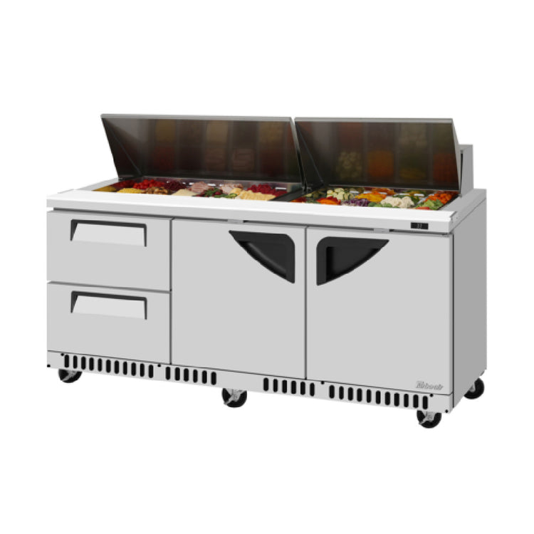 Turbo Air, TST-72SD-D2LR-FB-N, Super Deluxe Sandwich/Salad Unit, front breathing airflow, three-section, 17.6 cu. ft., 72-5/8"W x 30"D x 37-5/8"H, (18) 1/6 size 4" deep pans, (2) drawers, (2) doors, stainless steel interior & exterior (galvanized steel back & bottom), self-cleaning condenser equipped, 9-1/2" deep cutting board with side rail, R290 Hydrocarbon refrigerant, 3/8 HP, 115v/60/1-ph, 9.9 amps, NEMA 5-15P, cETLus, ETL-Sanitation