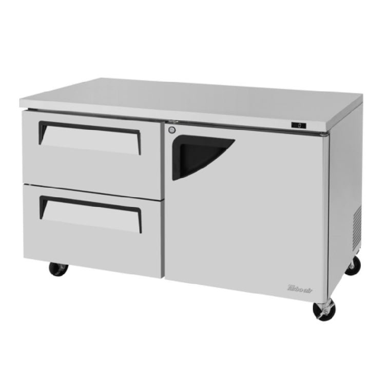 The Turbo Air TUF-60SD-D2R-N Super Deluxe Series Undercounter Freezer two-section is a versatile and compact cooling solution ideal for commercial kitchens and food service environments. With dimensions of 60-1/4" in width, 30" in depth, and 30" in height, it offers a substantial storage capacity of 17.2 cubic feet. This undercounter freezer is equipped with a self-contained rear mount refrigeration system that incorporates a self-cleaning condenser, ensuring efficient and low-maintenance operation. It features two drawers on the left and one right-hinged door on the right, providing flexible storage options. Inside, a stainless steel wire shelf organizes the space, while the stainless steel construction of the top, front, and sides ensures durability and ease of cleaning. The galvanized steel back and bottom further enhance its robust design. The interior is crafted from stainless steel with an ABS door liner, maintaining an optimal cooling environment. Utilizing R290 Hydrocarbon refrigerant and powered by a 1/2 HP motor, this freezer operates on 115 volts with 8.0 amps, connecting via a NEMA 5-15P cord. Certified by cETLus and ETL-Sanitation, the Turbo Air TUF-60SD-D2R-N is engineered for reliability and safety in demanding commercial settings.
