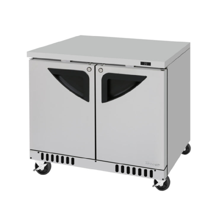 Turbo Air, TUR-36SD-FB-N, Super Deluxe Series Undercounter Refrigerator, Front Breathing airflow, two-section, 9 cu. ft., 36-1/4"W x 30"D x 30-5/8"H, (2) solid doors, stainless steel interior & exterior (galvanized steel back & bottom), (2) stainless steel wire shelves, self-cleaning condenser equipped, R290 Hydrocarbon refrigerant, 1/5 HP, 115v/60/1-ph, 6.5 amps, NEMA 5-15P, cETLus, ETL-Sanitation