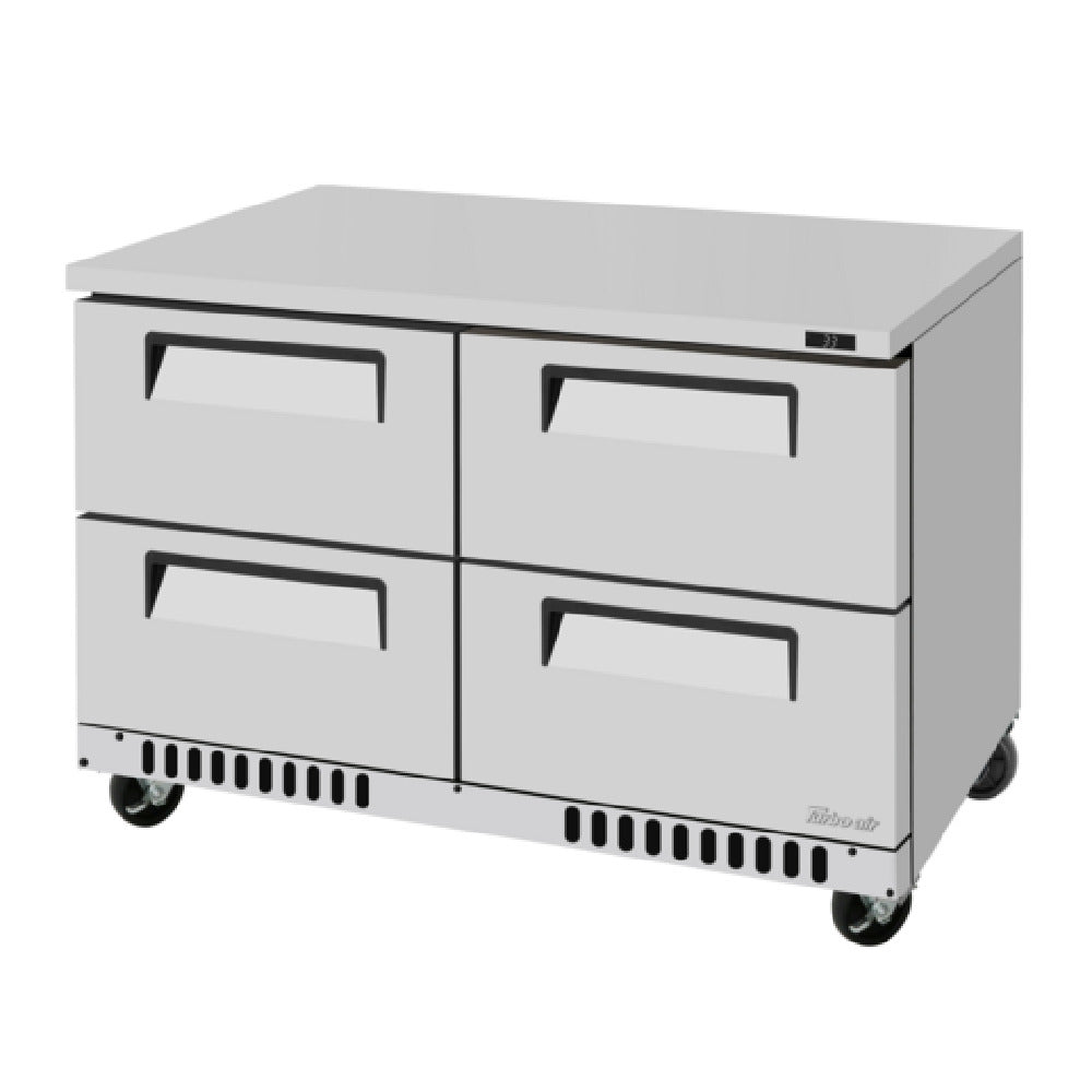 The Turbo Air TUR-48SD-D4-FB-N Super Deluxe Series Undercounter Refrigerator is a front-breathing airflow unit ideal for diverse food service environments. With a compact design measuring 48-1/4 inches in width, 30 inches in depth, and 30 inches in height, this two-section refrigerator provides a generous 11.1 cubic feet of storage space. It features four stainless steel drawers, ensuring durability and easy maintenance. The interior and exterior are crafted from premium stainless steel, complemented by a galvanized steel back and bottom for enhanced durability. This refrigerator is equipped with a self-cleaning condenser, a significant advantage in maintaining optimal performance and reducing maintenance efforts. Utilizing R290 Hydrocarbon refrigerant, it offers an eco-friendly refrigeration solution with a 1/5 horsepower motor, operating on 115 volts with a 6.5-amp draw. The Turbo Air TUR-48SD-D4-FB-N is designed to meet cETLus and ETL-Sanitation standards, confirming its compliance with rigorous safety and sanitation requirements. Its NEMA 5-15P plug ensures compatibility with standard electrical outlets. This refrigerator is a reliable choice for restaurants, cafes, and commercial kitchens, offering robust refrigeration capabilities and ease of integration into various culinary settings.