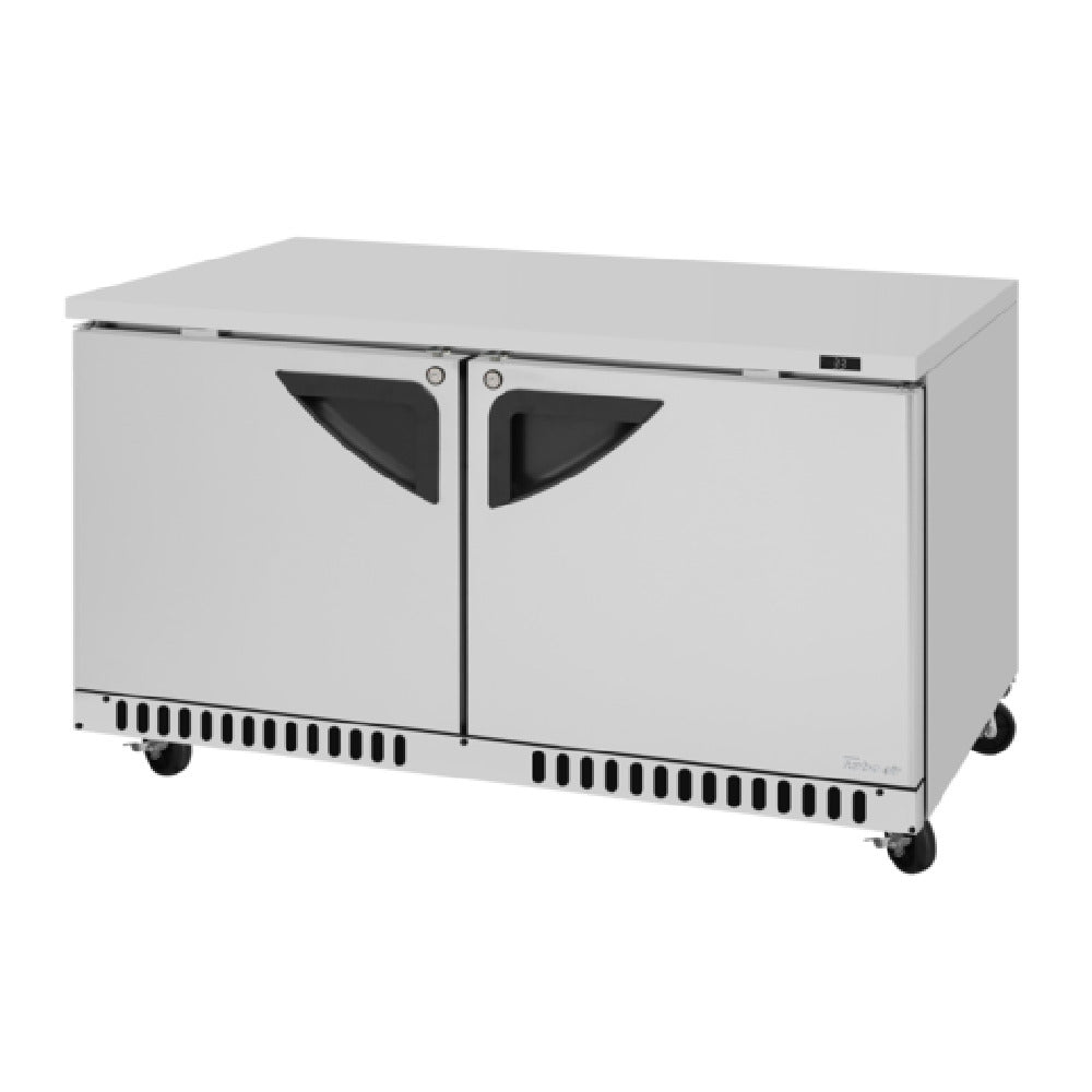 The Turbo Air TUR-60SD-FB-N Super Deluxe Series Undercounter Refrigerator - Front Breathing Airflow is a high-performance refrigeration solution designed for commercial settings that require efficient space utilization. This two-section refrigerator boasts a capacity of 14.8 cubic feet, with dimensions of 60-1/4 inches in width, 30 inches in depth, and 30 inches in height, making it an excellent choice for food service establishments with limited space. It features two solid hinged swing doors and is constructed with durable stainless steel for both the interior and exterior, with a galvanized steel back and bottom for added resilience. Equipped with two stainless steel wire shelves, it offers practical storage solutions. The refrigerator is engineered with a self-cleaning condenser, utilizing the environmentally friendly R290 Hydrocarbon refrigerant. Powered by a 1/5 HP motor, it operates on 115 volts, 60 Hz, and a single-phase electrical supply, drawing 8.9 amps. The unit comes with a NEMA 5-15P plug and is certified by cETLus and ETL-Sanitation, ensuring compliance with safety and sanitation standards. The Turbo Air TUR-60SD-FB-N is ideal for those in the food service industry seeking reliability, efficiency, and compact design in their refrigeration equipment.